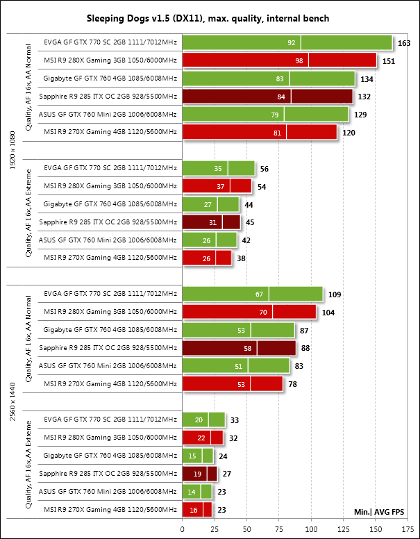 В Sleeping Dogs новинка вполне удачно включается в борьбу с обеими GeForce GTX 760, а в самом ресурсоёмком режиме и вовсе побеждает, правда частоту смены кадров в нём уже вряд ли можно назвать комфортной.