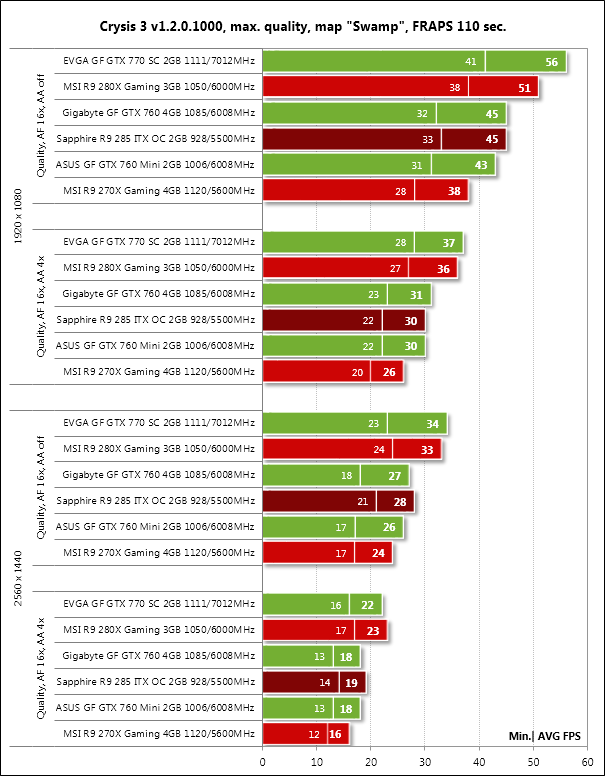 Без видимых усилий Radeon R9 285 в исполнении Sapphire одолевает обе GeForce GTX 760 и в игре Crysis 3, в том числе и по уровню минимального числа кадров в секунду.
