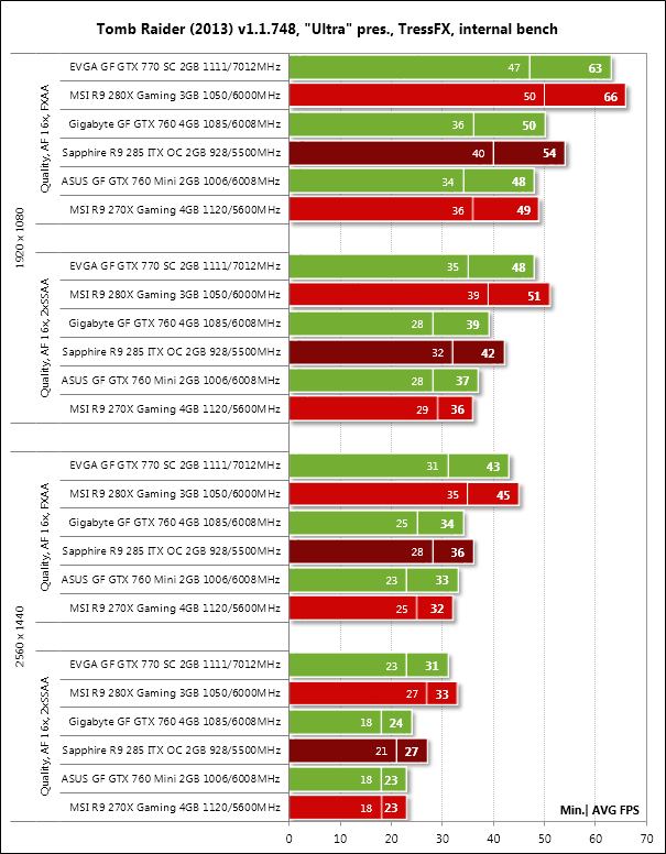 А вот в игре Tomb Raider преимущество Sapphire Radeon R9 285 ITX Compact OC Edition более весомое, чем в Crysis 3.