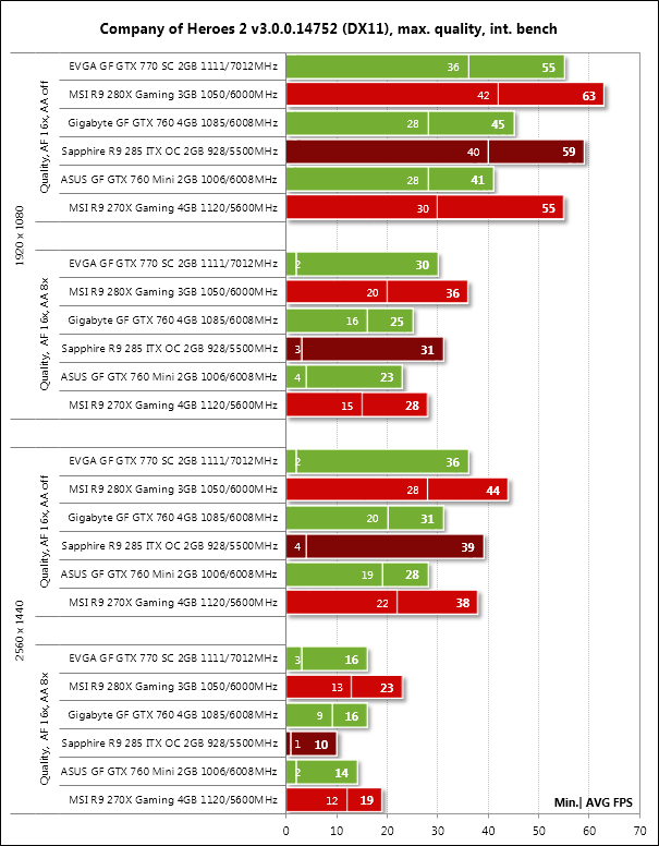 За исключением одной-двух игр в отдельных режимах качества, Sapphire Radeon R9 285 ITX Compact OC Edition стабильно и ожидаемо медленнее MSI Radeon R9 280X Gaming, в особенности в режимах с использованием сглаживания, ввиду недостатка оперативной памяти у новинки. Апогея эта нехватка достигает в наиболее ресурсоёмком режиме игры Company of Heroes 2, где оригинальная видеокарта Sapphire проигрывает до 57%. В среднем по всем игровым тестам отставание Radeon R9 285 от Radeon R9 280X составляет 9-13% без использования сглаживания и 16-20% при его активации.
