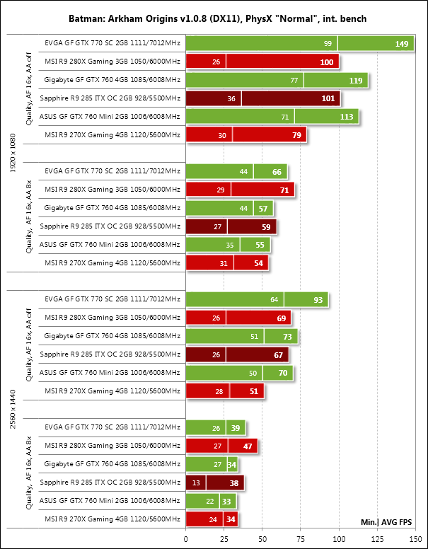Результаты в Batman: Arkham Origins, кроме традиционной разницы в расстановке сил между режимами без использования сглаживания и при его активации, отличились ещё и тем, что Sapphire Radeon R9 285 ITX Compact OC Edition вплотную подобралась к старшей MSI Radeon R9 280X Gaming, а в самом лёгком графическом режиме даже опередила её.