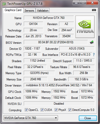 Для мониторинга температур и всех прочих параметров применялись программа MSI Afterburner версии 4.0.0 и утилита GPU-Z версии 0.7.9. Все тесты проводились в закрытом корпусе системного блока, конфигурацию которого вы сможете увидеть в следующем разделе статьи, при средней комнатной температуре 20 градусов Цельсия.
