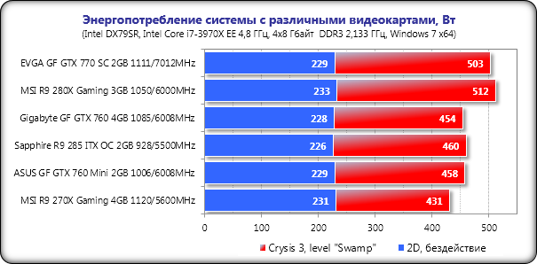 Измерение энергопотребления системы с различными видеокартами осуществлялось с помощью многофункциональной панели Zalman ZM-MFC3, которая показывает потребление системы «от розетки» в целом (без учёта монитора). Измерение было проведено в 2D-режиме при обычной работе в Microsoft Word или интернет-сёрфинге, а также в 3D-режиме. В последнем случае нагрузка создавалась с помощью четырёх последовательных циклов вступительной сцены уровня Swamp из игры Crysis 3 в разрешении 2560х1440 пикселей при максимальных настройках качества графики, но без использования сглаживания MSAA.