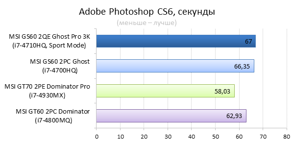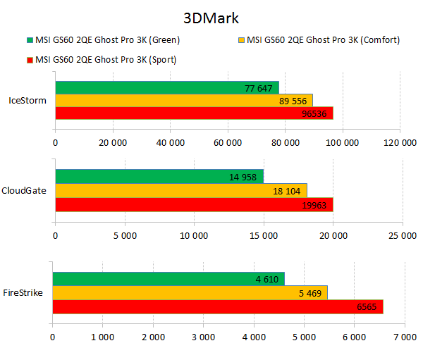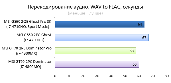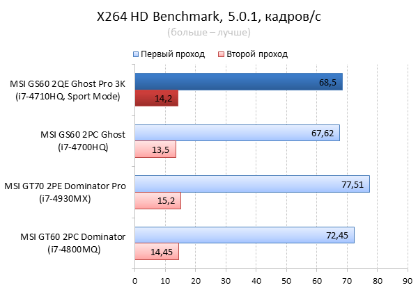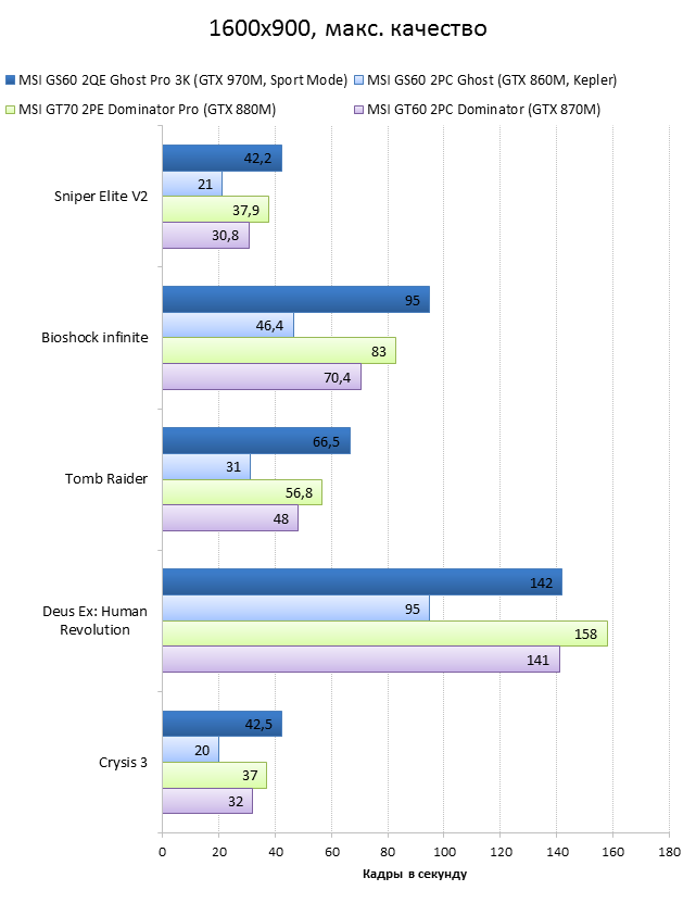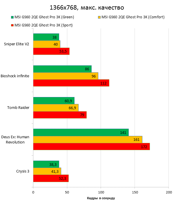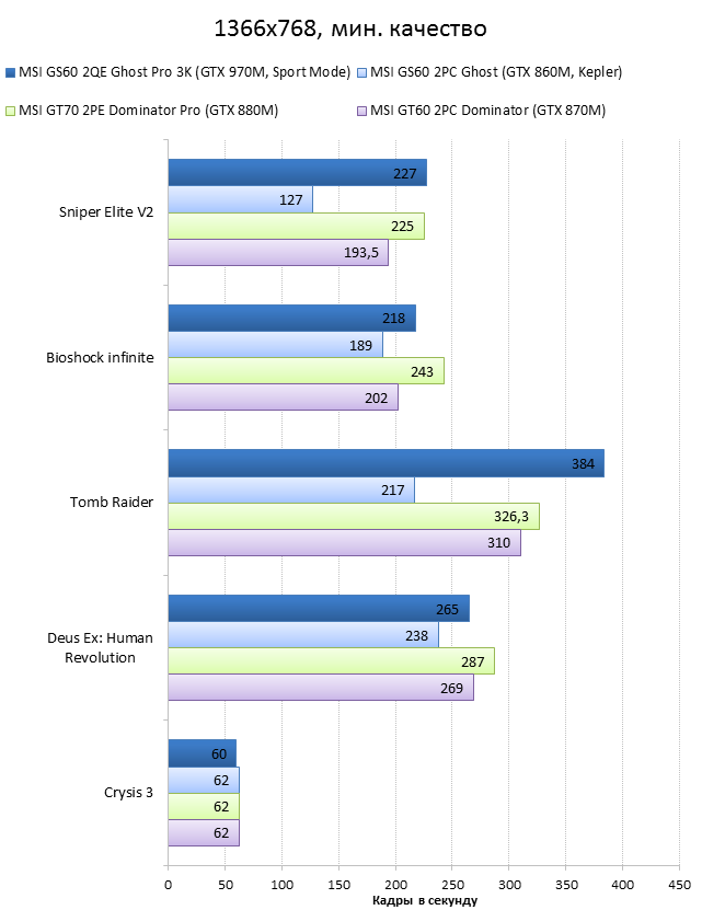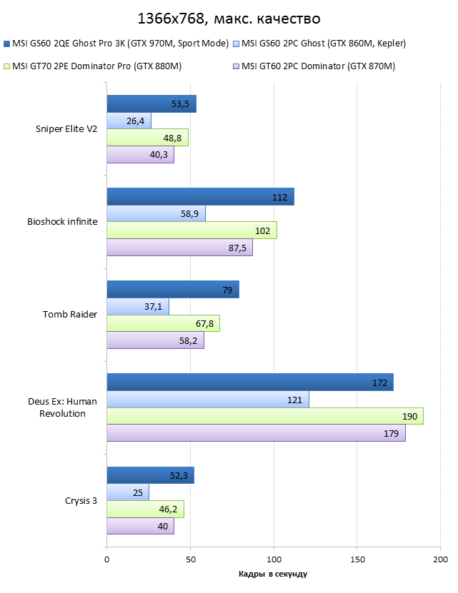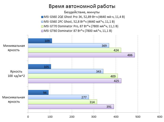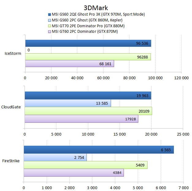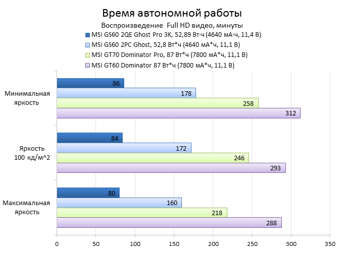Как видно из таблицы, сильнее всего все наши подопытные различаются своими видеоадаптерами. Они помогут нам продемонстрировать разницу между GTX 970M и графикой предыдущего поколения — GTX 880M и GTX 870M. Также в таблицу конкурентов был добавлен «Призрак» из нашего прошлого обзора, чтобы показать разницу между самым дорогим ноутбуком MSI GS60 и вариантом подешевле. Отметим, что в этой части систему MSI Shift мы перевели в режим «спортивный». Процессорные и синтетические бенчмарки      С одной стороны, самых выдающихся результатов наш главный подопытный не показал, что вполне логично, если учесть частоту его процессора. Ну а с другой стороны, производительность у MSI GS60 2QE Ghost Pro 3K очень высокая, а разницу между ним и его соперниками никак нельзя назвать очень большой.  В игровых бенчмарках наш «Призрак Про» показывает уже совсем другие результаты. Видеокарта NVIDIA GeForce GTX 970M оказалась очень мощной: ей по силам соперничать со старым флагманом — GTX 880M — и даже значительно обогнать его в субтесте Fire Strike. Что касается результатов обычного «Призрака» в субтесте IceStorm, то ноутбук был исключён из этого тестирования из-за некорректных результатов, которые выдал 3DMark во время теста.       В игровых тестах мы видим почти то же самое, что и в синтетических, — NVIDIA GeForce GTX 970M показывает результаты на уровне GTX 880M. В некоторых играх, например в Crysis 3 при разрешении 1920х1080 и максимальных настройках графики, только этой видеокарте удалось преодолеть порог в 30 FPS. ⇡#Тестирование времени автономной работы  А вот с временем автономной работы герою нашей статьи не повезло. Согласно результатам наших измерений, время автономной работы у MSI GS60 2QE Ghost Pro 3K примерно такое же, как у игровых ноутбуков двухлетней давности, которые могли работать только «от розетки до розетки». Мы дважды перепроверили эти результаты, но никаких изменений не нашли. Возможно, причина такого поведения кроется в некорректной работе NVIDIA Optimus — не исключено, что ноутбук по каким-то причинам не может переключиться на процессорное видеоядро, что и приводит к столь плачевным результатам. ⇡#ВыводыКомпания MSI продолжает нас радовать. Причём на этот раз мы видим не просто «ещё один мощный и компактный игровой ноутбук» — сегодня мы протестировали игровой портативный ПК, в котором появилась поддержка уникальной в своём роде технологии MSI Shift. С её помощью пользователь может сам выбирать, что ему важнее — производительность или тишина. О производительности MSI GS60 2QE Ghost Pro 3K стоит сказать отдельно — её здесь с запасом. Благодаря видеокарте NVIDIA GeForce GTX 970M этот тонкий и лёгкий игровой ноутбук может тягаться даже со «старым» флагманом MSI — толстым и тяжёлым «Доминатором Про» GT70. Не обошлось в нашем подопытном и без недостатков. Не всем пользователями понравится золотой цвет корпуса и не всем придётся по душе разрешение 2880х1620 пикселей — потребуется включать масштабирование, а оно в Windows далеко не идеальное. Впрочем, со временем можно будет найти в продаже чёрного «Призрака Про» с Full HD-экраном: и если цвет корпуса — вопрос вкуса, то Full HD-экран в данном случае выглядит предпочтительнее. Главное, чтобы все остальные параметры у него были не хуже, чем у 3K-экрана в протестированном ноутбуке. А они у него на высоте. Также не стоит считать такой ноутбук тихим — из-за его тонкого корпуса разработчикам не удалось установить внутри прои
