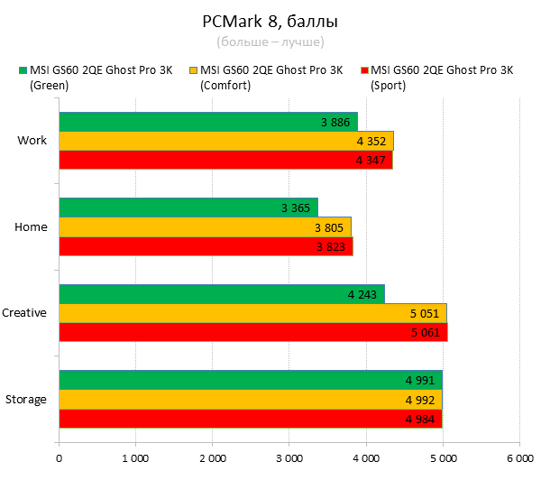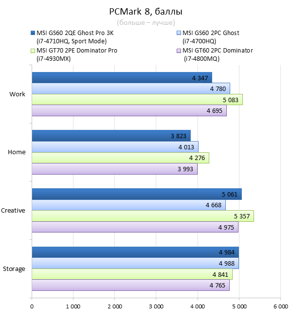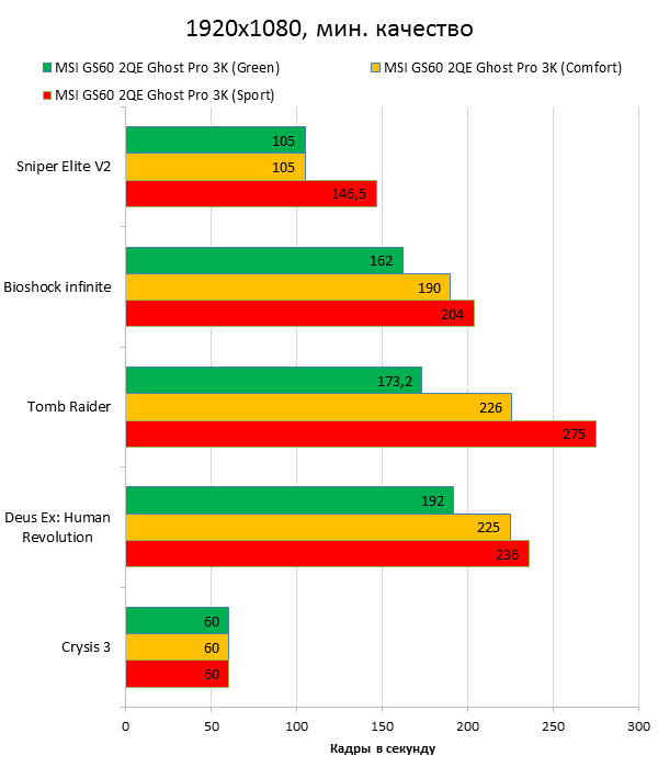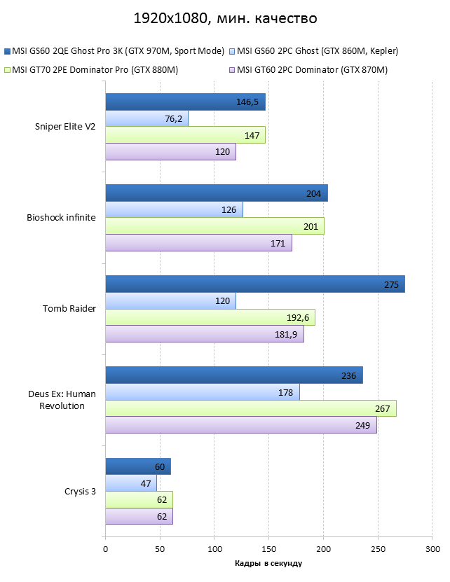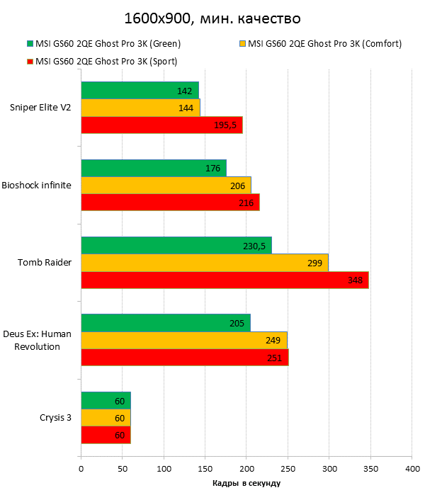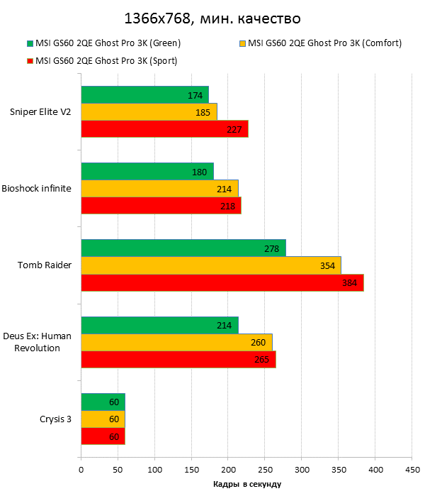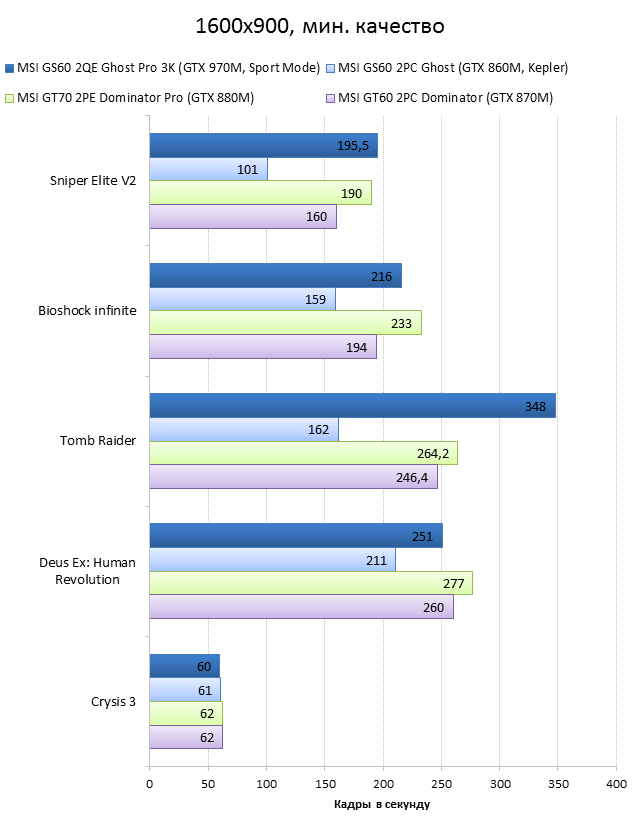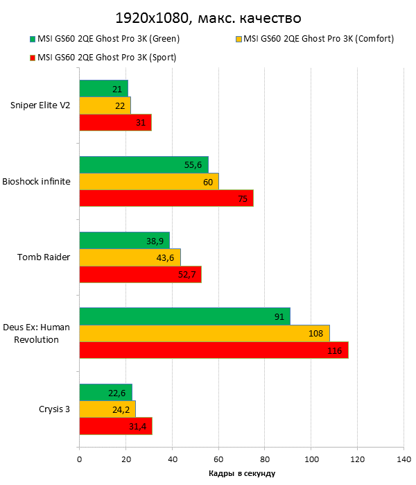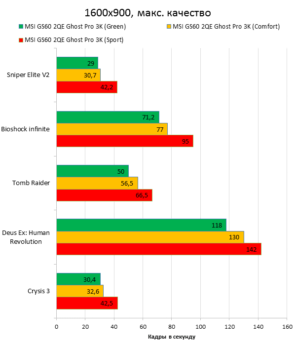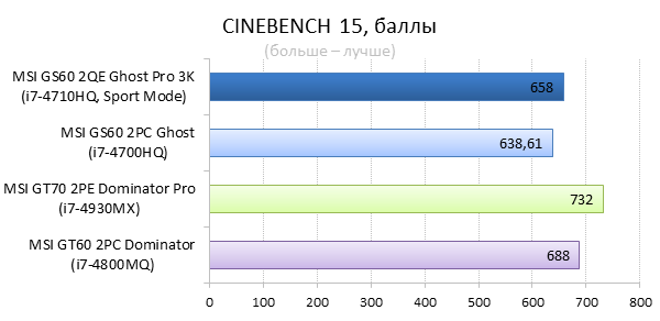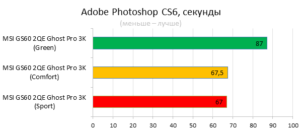 Как видно из таблицы, сильнее всего все наши подопытные различаются своими видеоадаптерами. Они помогут нам продемонстрировать разницу между GTX 970M и графикой предыдущего поколения — GTX 880M и GTX 870M. Также в таблицу конкурентов был добавлен «Призрак» из нашего прошлого обзора, чтобы показать разницу между самым дорогим ноутбуком MSI GS60 и вариантом подешевле. Отметим, что в этой части систему MSI Shift мы перевели в режим «спортивный». Процессорные и синтетические бенчмарки      С одной стороны, самых выдающихся результатов наш главный подопытный не показал, что вполне логично, если учесть частоту его процессора. Ну а с другой стороны, производительность у MSI GS60 2QE Ghost Pro 3K очень высокая, а разницу между ним и его соперниками никак нельзя назвать очень большой.  В игровых бенчмарках наш «Призрак Про» показывает уже совсем другие результаты. Видеокарта NVIDIA GeForce GTX 970M оказалась очень мощной: ей по силам соперничать со старым флагманом — GTX 880M — и даже значительно обогнать его в субтесте Fire Strike. Что касается результатов обычного «Призрака» в субтесте IceStorm, то ноутбук был исключён из этого тестирования из-за некорректных результатов, которые выдал 3DMark во время теста.       В игровых тестах мы видим почти то же самое, что и в синтетических, — NVIDIA GeForce GTX 970M показывает результаты на уровне GTX 880M. В некоторых играх, например в Crysis 3 при разрешении 1920х1080 и максимальных настройках графики, только этой видеокарте удалось преодолеть порог в 30 FPS. ⇡#Тестирование времени автономной работы  А вот с временем автономной работы герою нашей статьи не повезло. Согласно результатам наших измерений, время автономной работы у MSI GS60 2QE Ghost Pro 3K примерно такое же, как у игровых ноутбуков двухлетней давности, которые могли работать только «от розетки до розетки». Мы дважды перепроверили эти результаты, но никаких изменений не нашли. Возможно, причина такого поведения кроется в некорректной работе NVIDIA Optimus — не исключено, что ноутбук по каким-то причинам не может переключиться на процессорное видеоядро, что и приводит к столь плачевным результатам. ⇡#ВыводыКомпания MSI продолжает нас радовать. Причём на этот раз мы видим не просто «ещё один мощный и компактный игровой ноутбук» — сегодня мы протестировали игровой портативный ПК, в котором появилась поддержка уникальной в своём роде технологии MSI Shift. С её помощью пользователь может сам выбирать, что ему важнее — производительность или тишина. О производительности MSI GS60 2QE Ghost Pro 3K стоит сказать отдельно — её здесь с запасом. Благодаря видеокарте NVIDIA GeForce GTX 970M этот тонкий и лёгкий игровой ноутбук может тягаться даже со «старым» флагманом MSI — толстым и тяжёлым «Доминатором Про» GT70. Не обошлось в нашем подопытном и без недостатков. Не всем пользователями понравится золотой цвет корпуса и не всем придётся по душе разрешение 2880х1620 пикселей — потребуется включать масштабирование, а оно в Windows далеко не идеальное. Впрочем, со временем можно будет найти в продаже чёрного «Призрака Про» с Full HD-экраном: и если цвет корпуса — вопрос вкуса, то Full HD-экран в данном случае выглядит предпочтительнее. Главное, чтобы все остальные параметры у него были не хуже, чем у 3K-экрана в протестированном ноутбуке. А они у него на высоте. Также не стоит считать такой ноутбук тихим — из-за его тонкого корпуса разработчикам не удалось установить внутри прои