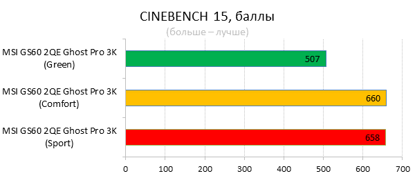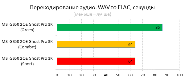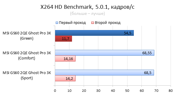 В «зелёном» режиме максимальная тактовая частота процессора лишь немного превышала частоту в простое и не выходила за отметку в 900 МГц. Частота видеоядра ни разу не достигла максимальной — она поднималась не выше 898 МГц при максимуме в 924 МГц (без использования авторазгона GPU Boost 2.0). При этом температура CPU и GPU составила 53 и 66 °C соответственно. Вентиляторы системы охлаждения вращались с частотой 4200 об/мин, а энергопотребление (из розетки) составило 90 Вт. График нагрузки и температуры процессора График нагрузки и температуры видеокарты Из нагрузочных графиков видно, что частоты CPU и GPU регулировалась динамически, в зависимости от нагрузки на них. Также динамически регулировалось и напряжение GPU, для уменьшения энергопотребления последнего. Кстати, такой же подход может встречаться и у десктопных видеокарт. Теперь посмотрим на работу «комфортного» режима. Максимальная частота процессора в этом режиме не изменилась и составила всё те же 900 МГц, а его температура подросла на один градус, до 54 °C. Максимальная частота видеокарты возросла до 1037 МГц, а её максимальная температура — до 73 °C. Вентиляторы системы охлаждения разогнались до 5100 об/мин, а энергопотребление составило 109 Вт. График нагрузки и температуры процессора График нагрузки и температуры видеокарты Если судить по графикам, в «комфортном» режиме частота и напряжение GPU были стабильными — они больше не регулировались динамически. Собственно, из-за этого и возросло как энергопотребление, так и частота вращения вентиляторов системы охлаждения. При включении «спортивного» режима максимальная частота процессора возросла до 1000 МГц, а его максимальная температура поднялась до 75 °C. Максимальная частота видеоадаптера не изменилась и осталась на уровне 1037 МГц, а его температура выросла на 4 градуса, до 77 °C. При этом частота вращения вентиляторов СО не изменилась — она осталась на уровне 5100 об/мин, — а энергопотребление снова выросло до 117 Вт. График нагрузки и температуры процессора График нагрузки и температуры видеокарты Нагрузочные графики наглядно объясняют причину увеличения температуры видеокарты и возросшего энергопотребления системы. Дело в том, что в «спортивном» режиме частота видеопамяти выросла с 1598 до 2505 МГц. Подведём предварительный итог. Система MSI Shift действительно работает и позволяет регулировать мощность, энергопотребление и шум ноутбука в определённых пределах. Тем самым пользователь MSI GS60 2QE Ghost Pro 3K может выбрать, что ему важнее: скорость работы или относительная тишина в комнате. Увы, бесшумно работать под максимальной нагрузкой наш подопытный не будет. Тем не менее Shift позволяет действительно серьёзно снизить уровень шума. Заодно мы показали, что система охлаждения MSI GS60 2QE хорошо справляется с возложенными на неё обязанностями. ⇡#Тестирование MSI Shift, часть вторая: исследование производительностиИтак, с особенностями работы MSI Shift мы разобрались, теперь пришла пора узнать производительность всех трёх профилей в бенчмарках и играх. Для этого мы будем использовать наш обычный набор тестов и все три профиля MSI Shift. Начнём, как обычно, с тестирования процессора.     Итак, если судить по нашим тестам, при использовании «зелёного» режима производительность процессора падает, что вполне закономерно. А вот между профилями «комфортный» и «спорт» особой разниц