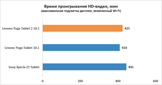 Например, при беспрерывном воспроизведении видеоролика в формате HD 720p с активным беспроводным соединением и обновлением данных на фоне Lenovo Yoga Tablet 2 10 разрядился за семь часов — результат далеко не рекордный. Примечательно, что продержалось устройство при выполнении данного норматива всего на пятнадцать минут дольше, чем первое поколение Yoga Tablet. Если снизить яркость дисплея, деактивировать беспроводные сети и не слишком активно нагружать процессорные ядра, планшет, вероятно, сможет продержаться обещанные восемнадцать часов. Однако при сценариях использования, близких к реальной жизни, гаджет разряжается быстрее — за десять-двенадцать часов, а если использовать его в игровых целях — разрядится и того быстрее.
