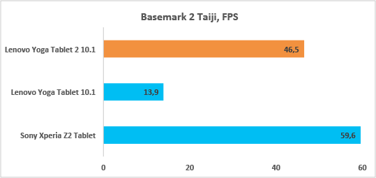 Правда, нагрузку на устройство необходимо правильно дозировать: чуть переборщишь — и оно может начать притормаживать. Например, в простеньком по современным меркам игровом тесте Basemark 2 Taiji гаджет набрал 46,5 FPS. Результат неплохой, однако большинство конкурентов упираются в границу vSync — 60 кадров в секунду. Впрочем, того, что есть, достаточно, чтобы простенькие 2D- и 2,5D-аркады на Yoga Tablet 2 работали вполне гладко.