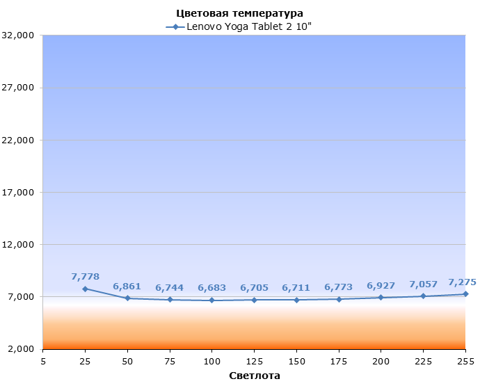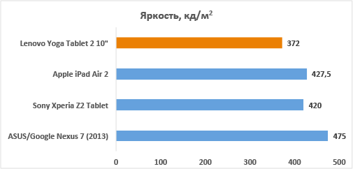 Запас яркости у экрана приличный: светимость белого поля достигает 372 кд/м2. Показатель неплохой, однако яркость конкурентов переваливает за четыреста кандел на квадратный метр. Впрочем, на недостаток яркости жаловаться не приходится. У дисплея Yoga Tablet 2 есть поляризационный фильтр, успешно борющийся с бликами. К тому же у него нет воздушной прослойки между защитным стеклом и непосредственно матрицей, что уменьшает количество нежелательных отражений. В темноте устройство не режет глаз: минимальная светимость белого поля — всего 17 кд/м2. У экрана, как и полагается, есть олеофобное покрытие, благодаря которому его поверхность легко очистить от отпечатков пальцев и другой грязи.