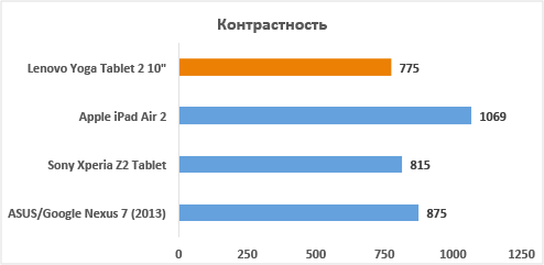 Светимость черного поля при 100%-й подсветке — 0,48 кд/м2. Результирующая контрастность экрана несколько меньше желаемого — 775:1. Первая «Йога» была ярче, но с контрастностью дела обстояли хуже. У новой показатель нормальный, но у конкурентов больше.