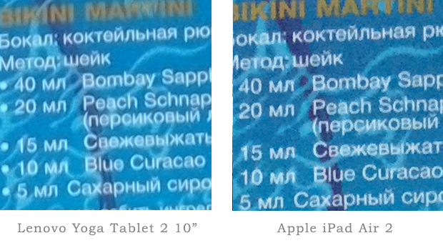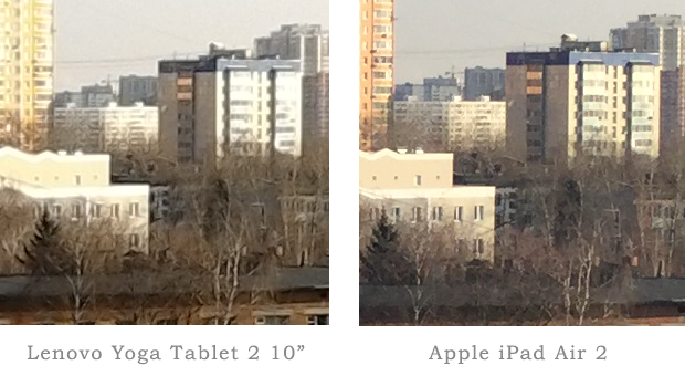 С уменьшением освещения падает и резкость снимков — у камеры Yoga Tablet 2 слишком агрессивный программный «шумодав», из-за которого кадр получился чересчур «мягким», нечетким. Фотография на Air 2 вышла более детальной, но и значительно более «шумной» — артефактов у нее больше. Цвета у обеих фотографий вполне приемлемые, контрастность тоже. Для планшетных камер вполне сойдет.