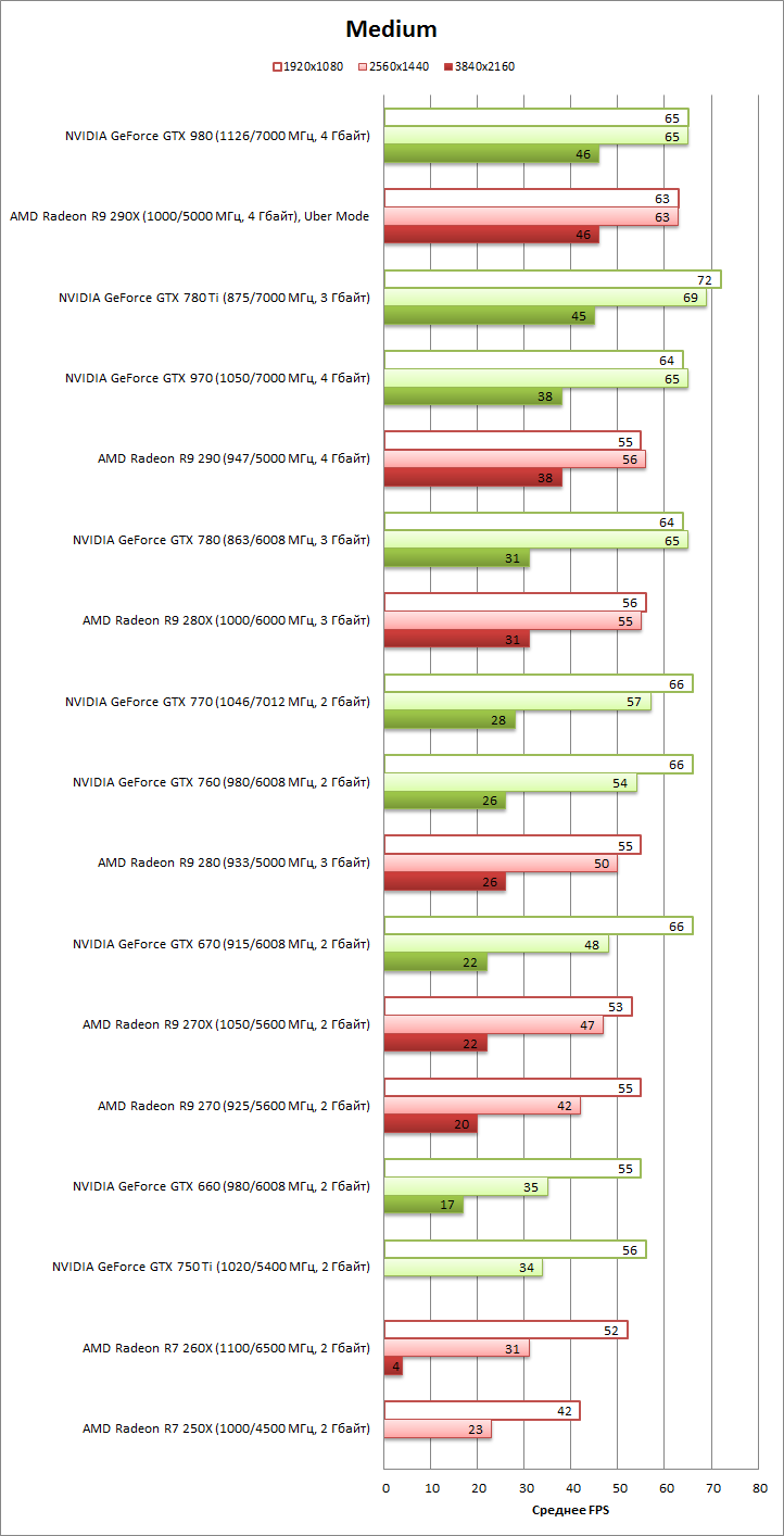 В тестировании представлены результаты следующих видеоадаптеров. Более младшие модели в линейках Radeon R5/R7 и GeForce 700 не обеспечили приемлемой частоты смены кадров при разрешении 1920 × 1080 даже с минимальными настройками графики.