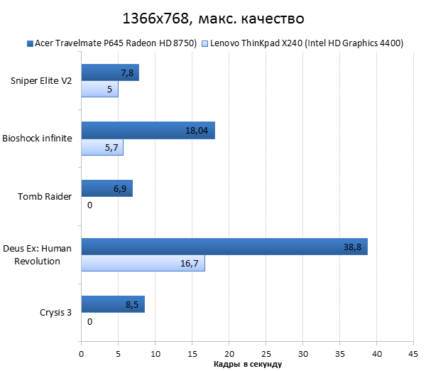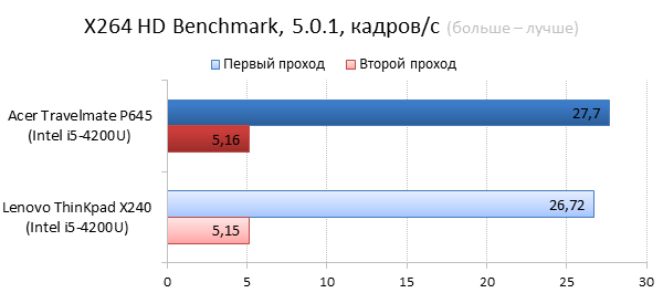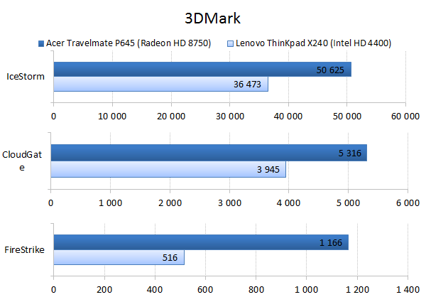 ![]() ![]() ![]() ![]() Процессоры у двух наших подопытных были одинаковыми, поэтому результаты в процессорных бенчмарках, за исключением субтеста Adobe Photoshop, получились похожими. В последнем тесте Acer Travelmate P645 смог уйти в отрыв только из-за своего большого объёма оперативной памяти. ![]() В финском бенчмарке PCMark 8, в субтестах Home и Creative, наш главный подопытный обгоняет своего соперника — в этом ему помогает дискретная видеокарта, которой лишён Lenovo ThinkPad X240. Ну а в субтесте Storage X240 берёт реванш, что неудивительно: полноценный SSD-накопитель всегда будет быстрее связки из жёсткого диска и кеширующего mSATA SSD. ![]() Дискретная видеокарта AMD Radeon HD 8750 не оставляет ни одного шанса интегрированному видеоядру Intel HD 4400. ![]() ![]() Если судить по игровым бенчмаркам, владелец Acer Travelmate P645 сможет отдохнуть от работы и проиграть в игры, причем не только казуальные. Правда, если запускать что-нибудь посложнее Braid или Limbo, то на хорошее качество графики и высокий FPS рассчитывать при этом не стоит. ⇡#Тестирование времени автономной работы![]() ![]() С «автономкой» у Acer Travelmate P645 полный порядок. Того времени, которое может обеспечить его встроенный аккумулятор, хватит на большую часть рабочего дня. На этом ноутбуке можно смотреть фильмы в течение 6 часов даже при максимальной яркости экрана. Хотя смотреть видео c плохой TN-матрицы — удовольствие сомнитльное. ⇡#ВыводыМожно смело сказать, что Acer Travelmate P645 удался. Благодаря приятному дизайну и металлическому корпусу выглядит ультрабук солидно и строго — а значит, на столе у начальника или успешного менеджера он будет смотреться вполне гармонично. Обузой этот ультрабук тоже не станет: при весе в 1,5 килограмма и толщине 20,8 мм он без проблем поместится в рюкзак, сумку или портфель. Тачпад и клавиатура, по-настоящему важные элементы рабочего ноутбука, у Acer вышли неплохо — страдать при работе за ноутбуком не придётся. Также стоит отметить целых три порта USB 3.0 — обычно на ультракомпактных ноутбуках и два таких разъёма можно посчитать за счастье, а тут производитель расщедрился на целых три порта — ещё один повод обрадоваться. Вот только к выбору Acer Travelmate P645 стоит подойти ответственно. Если в ноутбуке будет установлена TN-матрица с разрешением 1366 × 768 точек, то мы советуем дважды подумать над покупкой — слишком уж плохим оказалось качество картинки у такого экрана. На другой апгрейд — самостоятельную установку 3G-модема — также рассчитывать не стоит. Дело в том, что в нашей модификации провода от «сотовой» антенны не были выведены в корпус ноутбука. Во всех остальных случаях Acer Travelmate P645 можно смело рекомендовать к покупке в качестве «рабочей лошадки». Как показали наши тесты, со временем автономной работы у ноутбука всё хорошо, а дискретная видеокарта позволяет во что-нибудь поиграть, если захочется отдохнуть от работы. Редакция 3DNews.ru благодарит компанию «Графитек» за предоставленный колориметр X-Rite i1Display Pro.