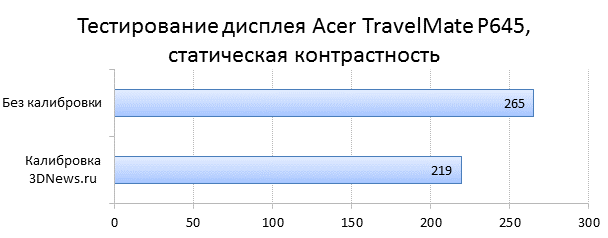Внутри ноутбука установлен процессор Intel Core i5-4200U, работающий с частотой 1,6 ГГц (до 2,6 ГГц в режиме Turbo Boost), кешем L3 объёмом 3 Мбайт и теплопакетом в 15 Вт. Оперативной памяти в ноутбуке с лихвой хватит для офисной работы — целых 8 Гбайт DDR3L-1600. Половина этого объёма была распаяна на материнской плате, а вторая половина установлена в стандартный разъём DDR3 SO-DIMM. Эту планку памяти можно заменить самостоятельно, если возникнет необходимость. Графическая подсистема состоит из двух GPU. Это встроенное процессорное видеоядро Intel HD Graphics 4400 и дискретная видеокарта AMD Radeon HD 8750M. Объём видеопамяти составляет 2 Гбайт GDDR5. Дисковая подсистема представлена двумя разными накопителями: mSATA SSD объёмом 24 Гбайт и 2,5-дюймовым жёстким диском объёмом 1 Тбайт. Из-за своего малого объёма диск mSATA работает в качестве кеша, но в продаже должны попадаться модификации с SSD большего объёма, в которых операционная система будет по умолчанию установлена на быстром накопителе. Как и у многих других компактных ноутбуков, аккумулятор у нашего героя встроенный, его ёмкость составляет 54 Вт·ч (4850 мА·ч, 11,1 В), а состоит он из трёх плоских ячеек. На момент написания этого обзора рассматриваемая нами модификация Acer Travelmate P645-MG-54208G1.02ttkk отсутствовала в продаже. Однако примерно за 55 тысяч рублей можно найти модификацию Travelmate P645 с Full HD-экраном и mSATA SSD объёмом 256 Гбайт. Правда, обычного жёсткого диска у такого ноутбука не будет, но эту ситуацию легко исправить самостоятельно. ⇡#Внутреннее устройствоНа днище ноутбука есть сервисная панель, за которой скрываются жёсткий диск и единственный съёмный модуль оперативной памяти. Большинству пользователей будет вполне достаточно таких возможностей апгрейда. Справа от сервисной панели можно заметить прямоугольный разъём док-станции, закрытый пластиковой заглушкой. Стоит отметить, что жёсткий диск был упакован в резиновый «бампер». Он частично гасит вибрацию диска, которая в противном случае передавалась бы на корпус, а оттуда на клавиатуру и тачпад. Если снять днище Acer Travelmate P645 целиком, то можно увидеть всю внутреннюю сущность нашего подопытного. В левом верхнем углу можно заметить модуль Wi-Fi, справа от которого есть посадочная площадка для 3G-модема. Вот только самостоятельная установка последнего вряд ли возможна, потому как к этой площадке не подведены провода от 3G-антенн, которые традиционно располагаются в крышке ноутбука. Под единственной турбиной находится твердотельный накопитель mSATA, а слева от него — модуль TPM, который отвечает за шифрование накопителя. К сожалению, в официальных поставках этот модуль принудительно отключён, а потому толку от него немного. ⇡#Тестирование экранаКак мы уже писали, в Acer Travelmate P645 была установлена матрица с разрешением 1366 × 768 пикселей и матовым покрытием. К сожалению, эта матрица относится к категории TN, причём не самого лучшего качества. Углы обзора у нашего подопытного минимальны даже по меркам дешёвых ноутбучных экранов. Производителем матрицы оказалась компания AU Optronics, модель — AUO B140XTN02.A. ![]() ![]() ![]() До калибровки яркость белого и чёрного полей составила 220 кд/м2 и 0,83 кд/м2 соответственно. После этой процедуры яркость белого упала до 193 кд/м2. А вот яркость чёрного, наоборот, выросла до 0,88 кд/м2. В результате контрастность экрана, и без того небольшая, упала с 265:1 до 219:1. Это довольно слабые результаты, к