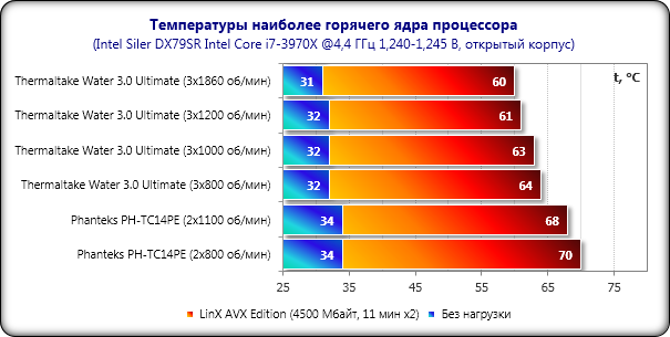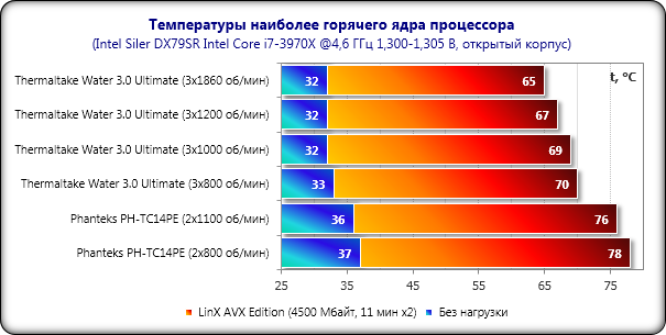 Ну вот и свершилось. Теперь заводская система жидкостного охлаждения выигрывает у лучшего воздушного кулера не только в высокоскоростных режимах работы вентиляторов, но и при минимальном уровне шума. Причём если сравнивать Thermaltake Water 3.0 Ultimate и Phanteks PH-TC14PЕ при скорости вентиляторов 800 об/мин, то преимущество жидкостного охлаждения перед воздушным составляет 6 градусов Цельсия в пике нагрузки, а при максимальной скорости вентиляторов оно не менее 8 градусов Цельсия. Одновременно отметим очень низкую зависимость эффективности Water 3.0 Ultimate от скорости вентиляторов — разница между максимальными и минимальными оборотами по температуре составила всего 4 градуса Цельсия. Как мы и предполагали, продуть такой тонкий радиатор не составило никакого труда.
