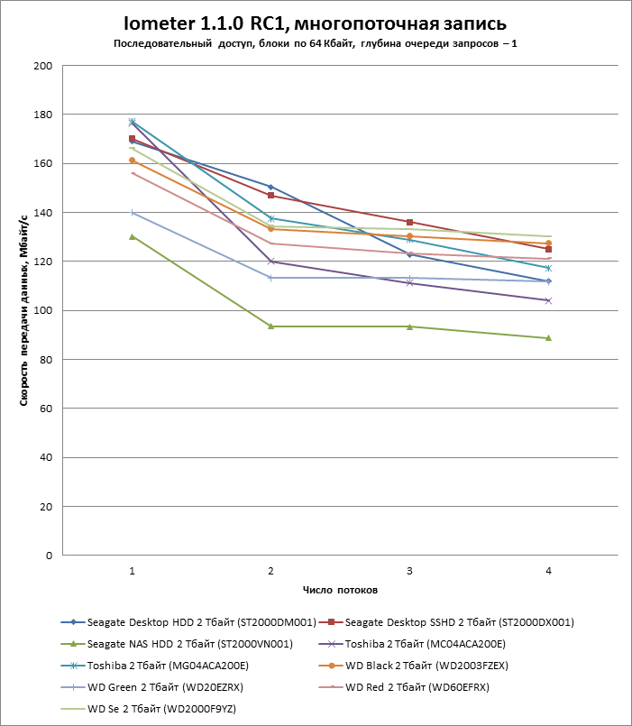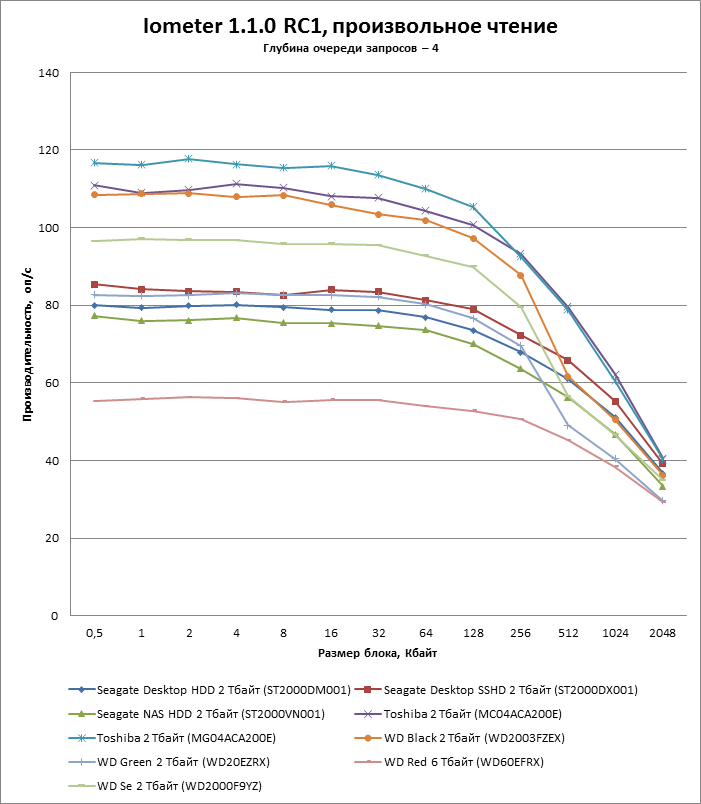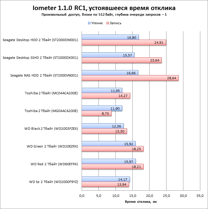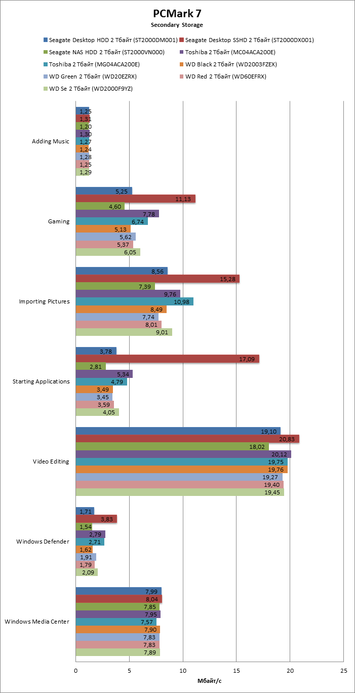 Остальные представители Western Digital нынче выступили откровенно слабо. WD Black сдерживает плотность записи 800 Гбайт. Общая производительность у него — на уровне современных пятитысячников с терабайтными пластинами. WD Black по-прежнему хорошо играет в задачах с произвольным доступом, но не лучше, чем безупречные в прочих отношениях Toshiba, так что, откровенно говоря, своих денег этот привод не стоит.