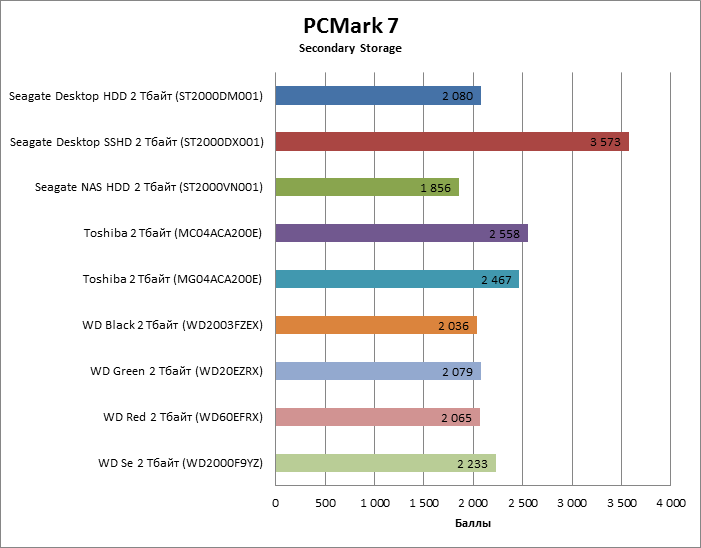 Синтетический тест, эмулирующий нагрузку реальных приложений и различные паттерны использования ресурсов ПК. Бенчмарк установлен на основном накопителе стенда. На тестируемом накопителе создается единственный раздел в файловой системе NTFS на весь доступный объем, и в PCMark 7 проводится тест Secondary Storage. В качестве результатов теста учитывается как итоговый балл, так и скорость выполнения отдельных субтестов.
