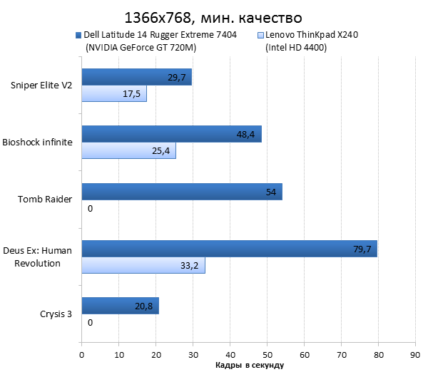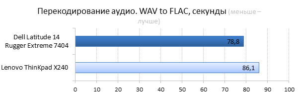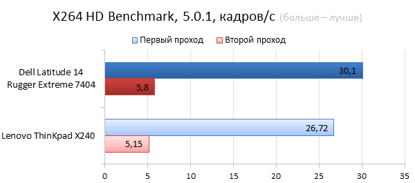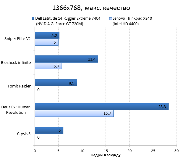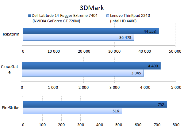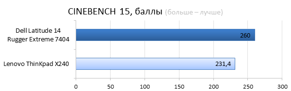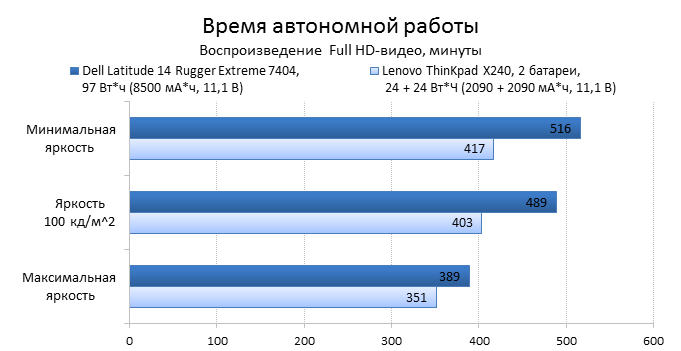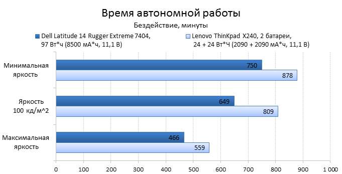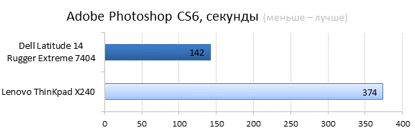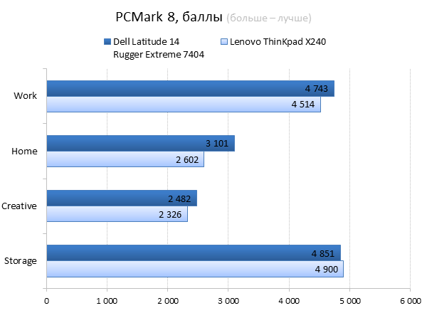 ⇡#Процессорные и игровые бенчмарки![]() ![]() ![]() ![]() В первой партии тестов процессорная производительность расставила всё по своим местам. Благодаря чуть более шустрому процессору побеждает главный герой нашей статьи. Что же касается странных результатов в бенчмарке Adobe Photoshop, то их можно объяснить малым объёмом оперативной памяти у наших подопытных. При заполнении оперативки «Фотошоп» начинает кешировать данные на накопитель. В данном случае в обоих ноутбуках установлены быстрые SSD-накопители, которые должны решить проблему кеширования, однако свободного места на них оказалось очень мало, около 10 Гбайт, а при малом количестве свободного пространства производительность SSD начинает снижаться. Видимо, такого объёма свободного места оказалось достаточно для того, чтобы результаты Lenovo x240 получились слишком низкими. Отсюда и возникает такая разница в производительности в субтесте Adobe Photoshop. ![]() В финском бенчмарке PCMark 8 доминирование нашего главного подопытного продолжилось. В субтестах Work и Home оно оказалось довольно значительным благодаря дискретной видеокарте, которая есть у Dell Rugged Extreme 7404. ![]() ![]() ![]() Результаты графических бенчмарков можно и предугадать: ноутбук с дискретным видео всегда будет быстрее ноутбука с процессорной графикой. Именно это и видно на графиках. ⇡#Тестирование времени автономной работы![]() ![]() В режиме бездействия Dell Rugged Extreme 7404 проработал достаточно долго, но не дольше, чем его соперник, — в этом может быть виноват экран «Делла», ведь он на 1,5 дюйма больше, чем у Lenovo ThinkPad X240. А вот при воспроизведении видео ситуация становится иной. Dell Rugged Extreme 7404 без проблем обходит своего конкурента во всех трёх субтестах. ⇡#ВыводыDell Latitude 14 Rugged Extreme 7404 — типичный представитель ноутбуков из «защищённого» сегмента. Выглядит он старомодно, зато имеет степень защиты IP65, то есть защищен от пыли, песка и струй воды. Кроме того, наш герой может работать при температурах от -29 до +63 °C. По своей производительности наш подопытный напоминает обычный ультрабук: внутри него находится низковаттный процессор Intel i5-4300U и самая простая дискретная видеокарта NVIDIA GeForce GT 720M. При этом стоить Dell Latitude 14 Rugged Extreme 7404 будет совсем не дёшево — около 200 000 рублей. Впрочем, подобные ноутбуки вообще редко бывают дешёвыми. Защищённые ноутбуки — очень редкий вид портативных ПК. При создании таких лэптопов основной акцент делается на защите устройства от воды, пыли, песка, критических температур и всех прочих опасностей, которые может представлять окружающая среда для нежной и беззащитной электроники. Поэтому вполне понятно, почему производительность, внешний вид и даже цена зачастую отходят на второй план. И если вы твёрдо уверены в том, что вам необходим защищённый ноутбук, то стоит присмотреться к Dell Latitude 14 Rugged Extreme 7404.