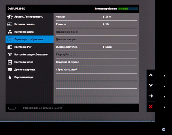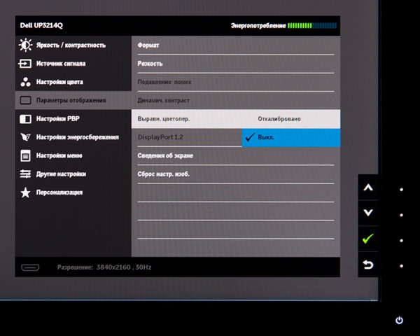 В меню у Dell UltraSharp UP3124Q нашлось большое количество настроек, но по каким-то причинам не все из них можно «покрутить» одновременно. Например, нельзя настроить цветовую температуру вручную, а потом изменить настройки цвета вроде усиления, смещения, оттенка и насыщенности (Gain, Offset, Hue, Saturation) или же поменять цветовой охват.