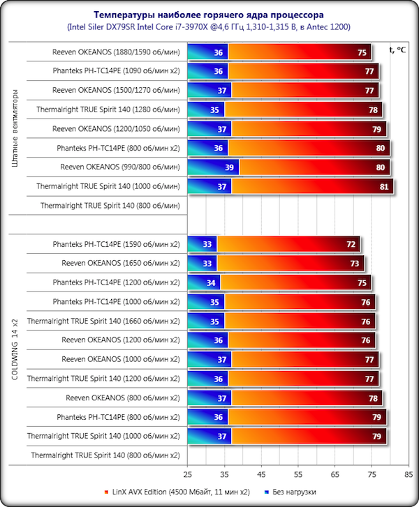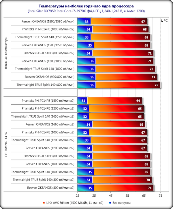 Результаты с одинаковыми 140-мм вентиляторами COLDWING 14 получились более плотными, и в этом режиме тестирования эффективность Reeven OKEANOS уже не впечатляет, хотя он по чуть-чуть и выигрывает у самого себя со штатными вентиляторами в каждом скоростном режиме работы. Phanteks PH-TC14PЕ по-прежнему эффективнее оппонента на пару градусов Цельсия. Иначе говоря, с таким мизерным отставанием Reeven OKEANOS определённо стоит отнести к суперкулерам, но абсолютным лидером его назвать нельзя. Однако мы всё же не будем спешить с выводами.