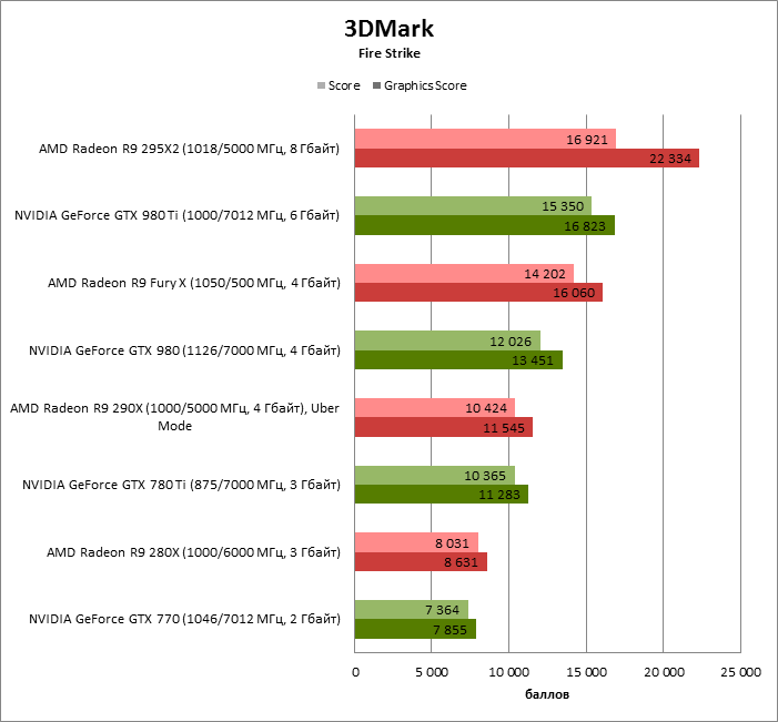 В обеих версиях самого популярного синтетического бенчмарка Radeon R9 Fury X занял позицию между GeForce GTX 980 и GTX 980 Ti. Прирост производительности по сравнению с Radeon R9 290X стремится к приросту транзисторного бюджета Fiji по сравнению с Hawaii.