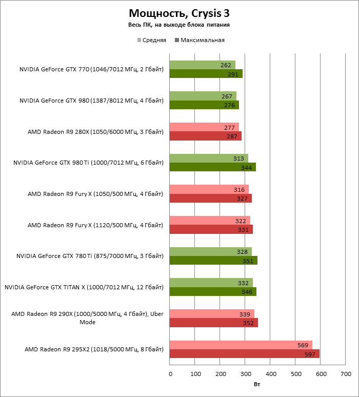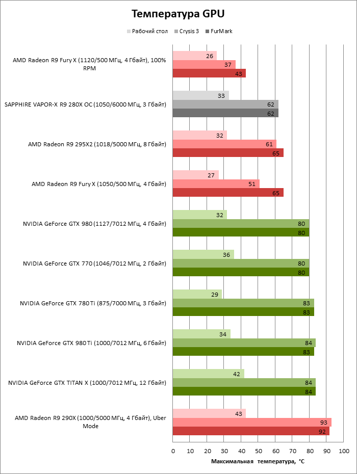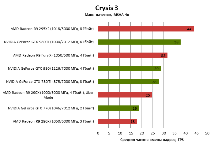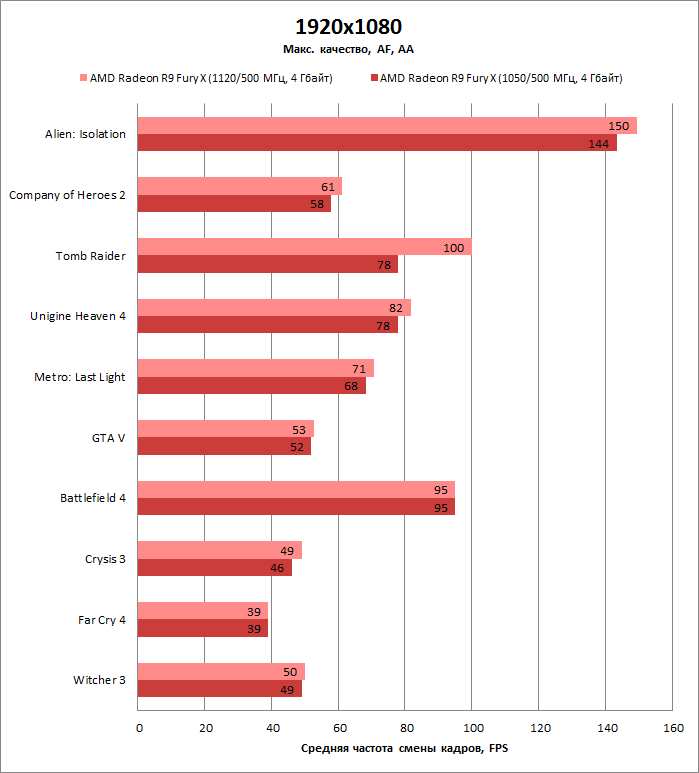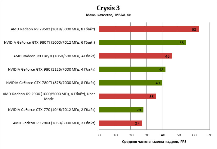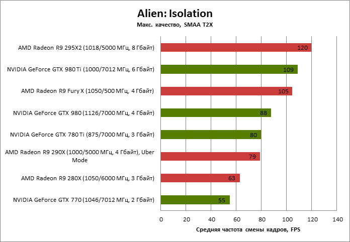 Здесь, как и в 3DMark, Fury X оставил позади GeForce GTX 980, но все еще не может тягаться на равных с GTX 980 Ti. Причем позиция Fury X ближе к «ванильной» версии GTX 980, что опять-таки объяснимо высокой геометрической нагрузкой в Unigine Heaven.