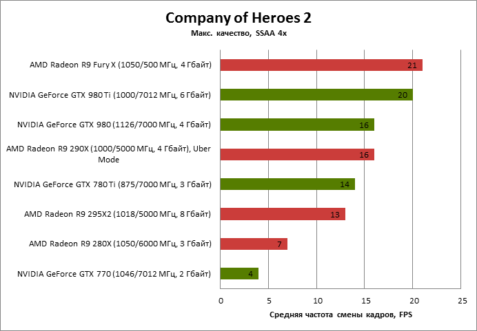 Рост разрешения улучшает позиции Radeon R9 Fury X. В частности, в CoH 2 установился паритет между новинкой и GeForce GTX 980 Ti. В GTA V и Far Cry 4 ликвидировано постыдное для столь мощного GPU отставание от GeForce GTX 980