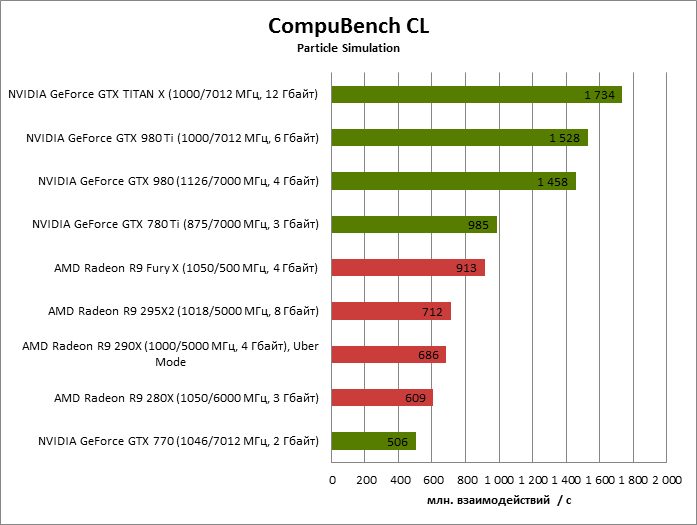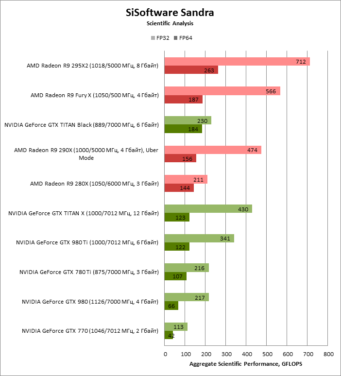 Fury X получил статус лучшего ускорителя для расчетов этого типа с одинарной точностью. По производительности FP64 новый флагман не уступает до сих пор непревзойденному GeForce GTX TITAN Black.