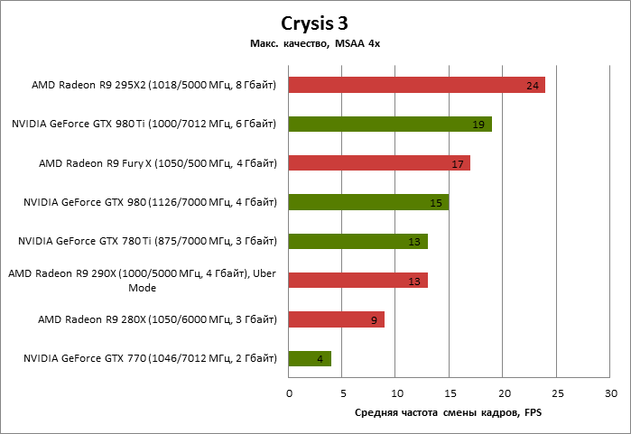 Здесь, напротив, адаптеры NVIDIA не знают равных, а все, на что способен Fury X, – это догнать GeForce GTX 780 Ti, в то время как TITAN X и GTX 980 Ti остаются на недосягаемой высоте.
