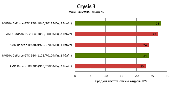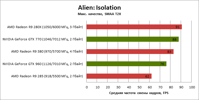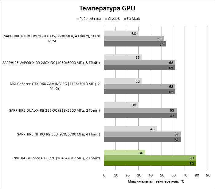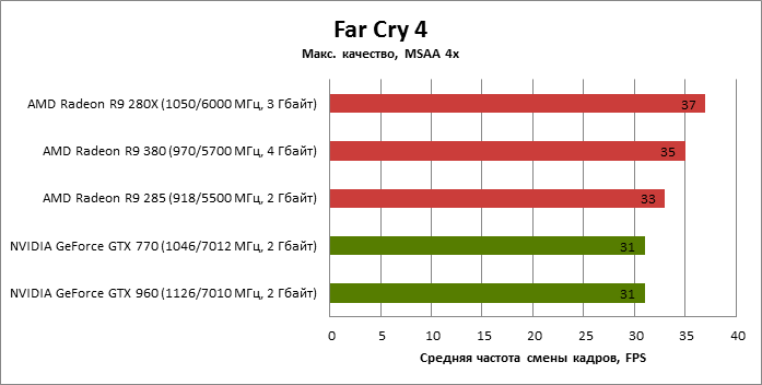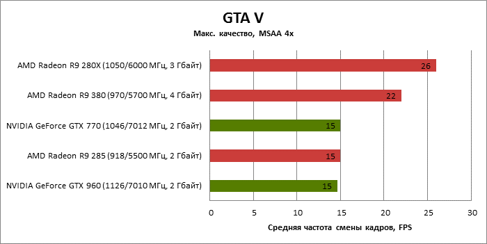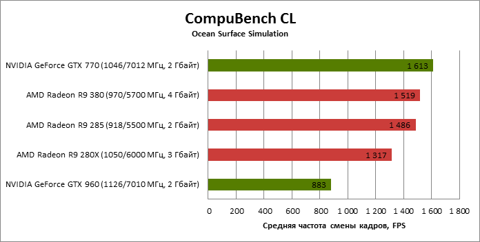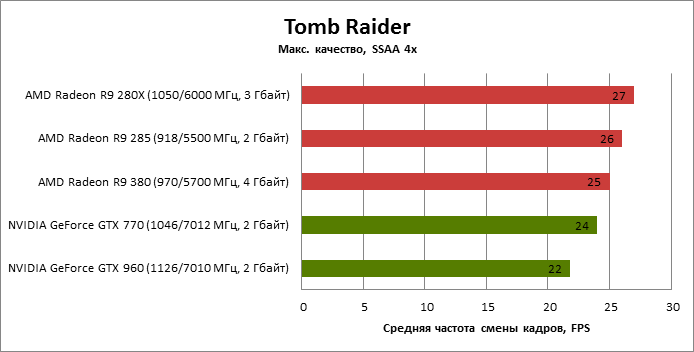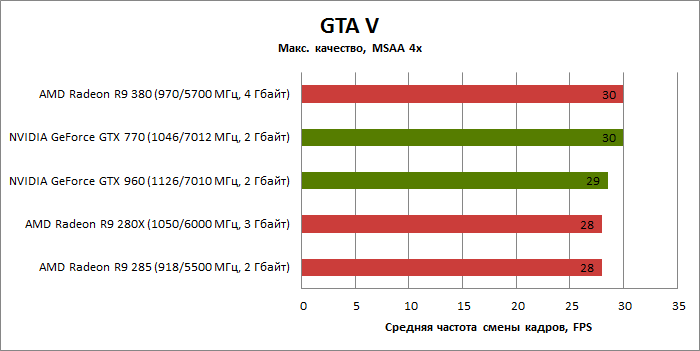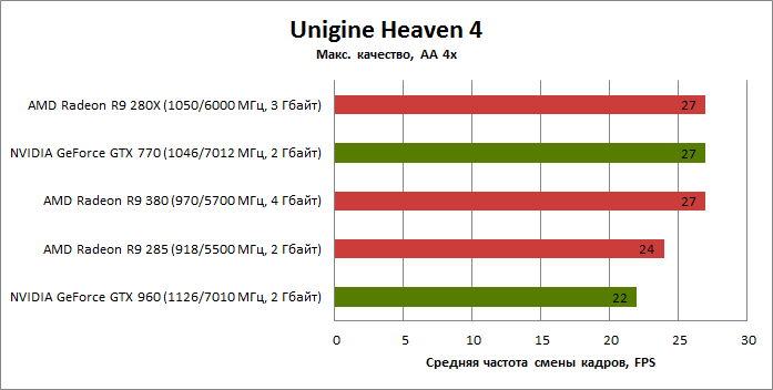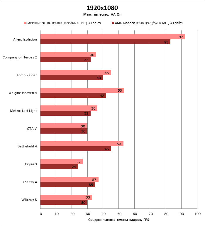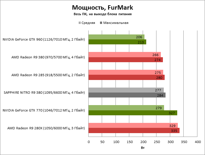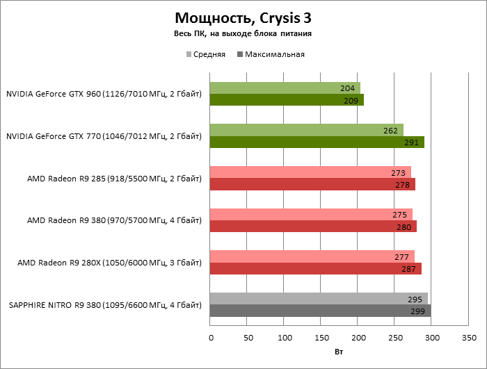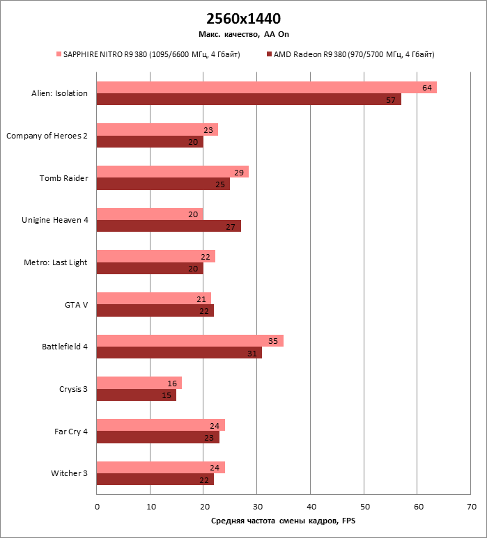 ⇡#Энергопотребление, температура, разгонНаш образец SAPPHIRE NITRO R9 380 довольно неплохо разогнался – до 1095 МГц по частоте GPU и до 5700 МГц по эффективной частоте видеопамяти. На референсных частотах видеокарта остается в пределах энергопотребления, заданных Radeon R9 285, и разгон несущественно повлиял на полученные числа. GeForce GTX 960, как и следовало ожидать, проявил себя как более экономичный видеоадаптер. ![]() ![]() Открытый кулер SAPPHIRE NITRO R9 380 обеспечивает чипу Antigua/Tonga вполне комфортный температурный режим на штатных частотах при автоматическом контроле скорости вентиляторов. У системы охлаждения есть запас мощности для разгона, но существенно снизить температуру можно лишь ценой неприемлемо высокого уровня шума. `⇡#Производительность: синтетические тестыОба синтетических бенчмарка демонстрируют небольшое, но вполне существенное преимущество Radeon R9 380 перед R9 285. Если сравнивать R9 380 с GeForce GTX 960, то 3DMark версии 2011 года отдает предпочтение видеокарте NVIDIA, 3DMark 2013 – наоборот. Графические карты прошлого поколения – Radeon R9 280X и GeForce GTX 770 обеспечивают заметно более высокий уровень производительности. ![]() ![]() ⇡#Unigine Heaven 4В Unigine Heaven разница между R9 380 и R9 285 не превышает 3 кадров в секунду при использованных настойках. GTX 960 показывает лучшие результаты при разрешении 1920 × 1080, но не идет ни в какое сравнение с Radeon R9 380 в режиме WQHD. 1920 × 1080 ![]() 2560 × 1440 ![]() ⇡#Производительность: игры1920 × 1080 В большинстве игр, как и следовало ожидать, увеличенный объем памяти Radeon R9 380 не дает ему осязаемого преимущества перед R9 285. Единственное исключение – Alien: Isolation. В пяти из девяти игровых тестов Radeon R9 380 одержал победу над основным соперником – GeForce GTX 960. Только в Battlefield 4 соотношение обратное. В остальных случаях GTX 960 и R9 380 примерно равны по быстродействию. Впрочем, в абсолютном выражении разница между этими адаптерами невелика. ![]() ![]() ![]() ![]() ![]() ![]() ![]() ![]() ![]() 2560 × 1440 При разрешении WQHD GeForce GTX 960 уже не смог взять реванш ни в одном из игровых тестов. Кроме того, есть три игры (Alien: Isolation, Far Cry 4 и GTA V), в которых недостаточный объем RAM привел видеокарту NVIDIA к сокрушительному поражению. Впрочем, Far Cry 4 и GTA 5 при таких настройках (максимальное качество графики, полноэкранное сглаживание и разрешение 2560 × 1440) не по зубам ускорителям этой категории, даже если снять ограничение по объему памяти. ![]() ![]() ![]() ![]() ![]() ![]() ![]() ![]() ![]() ⇡#Производительность: разгонРазгон видеоадаптеров среднего уровня производительности – как правило, довольно бессмысленное занятие с практической точки зрения. Вот и в данном случае результаты гораздо лучше заметны в синтетических тестах, чем в реальных играх, где весь эффект от довольно существенного повышения частот GPU и RAM сводится к нескольким дополнительным FPS. 3DMark 2011 ![]() 3DMark ![]() Игровые тесты + Unigine Heaven 4 ![]() ![]() ⇡#Производительность: вычисленияРасстановку сил в вычислительных задачах определяет специфика каждого конкретного приложения. Как уже не раз было при сравнении архитектуры AMD GCN с NVIDIA Maxwell, Radeon R9 380 лучше себя проявил в тесте Scientific Analysis пакета SiSoftware Sandra и ускорении рендеринга видео Sony Vegas 13 Pro. В остальных победа осталась за GeForce GTX 960. Luxmark: Room (Complex Benchmark) ![]() Sony Vegas Pro 13 ![]() CompuBench CL: Ocean Surface Simulation ![]() CompuBench CL: Particle Simulation ![]() SiSoftware Sandra 2015: Scientific Analysis ![]() ⇡#ВыводыAMD Radeon R9 380 нельзя назвать по-настоящему новым продуктом. По сравнению с R9 285, обновленной версией которого он, по сути, яв