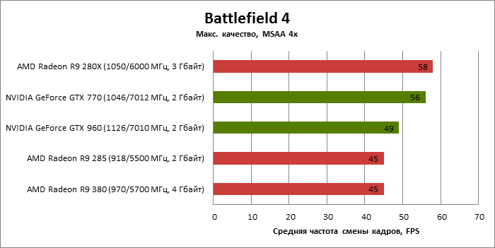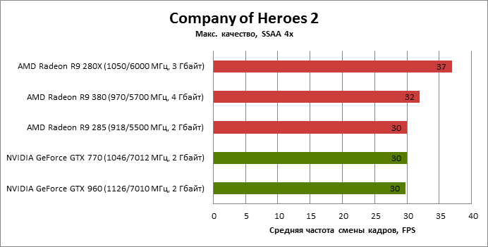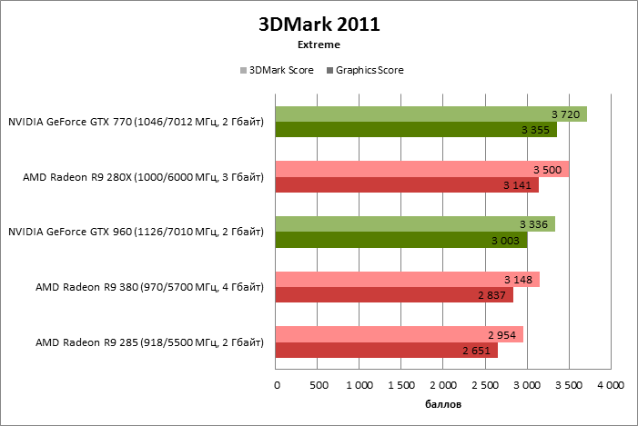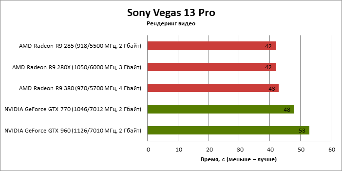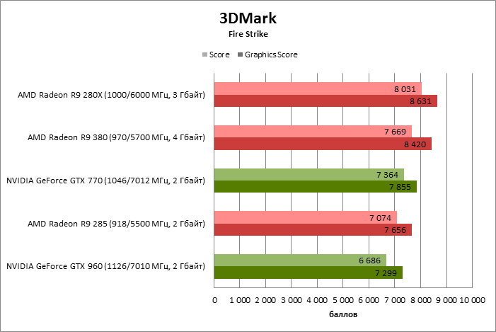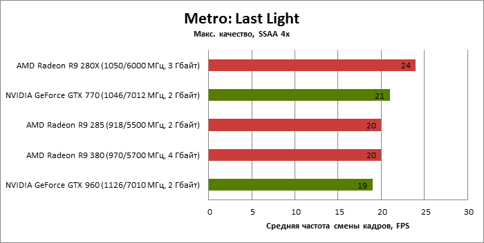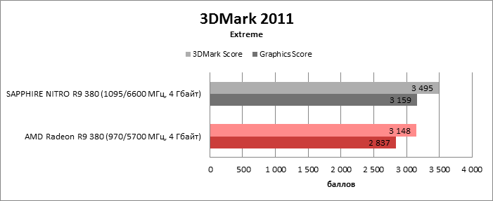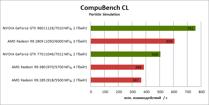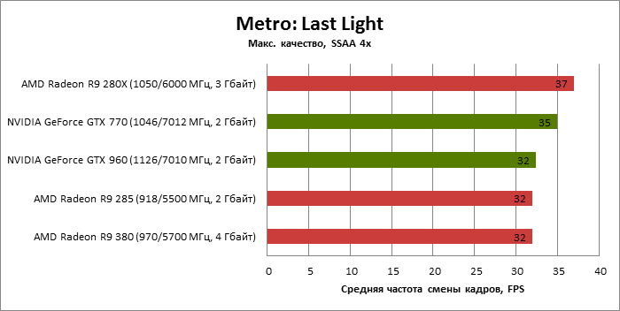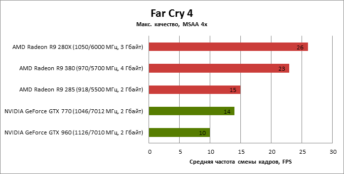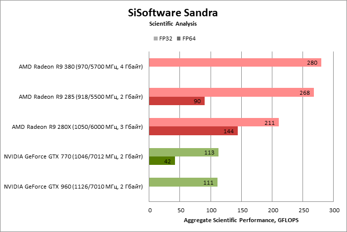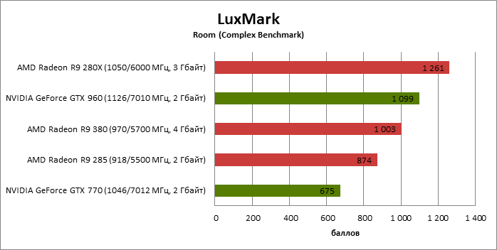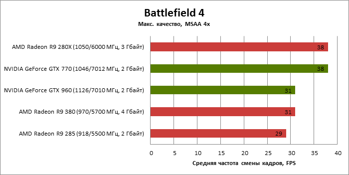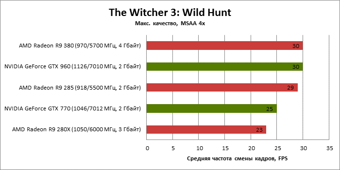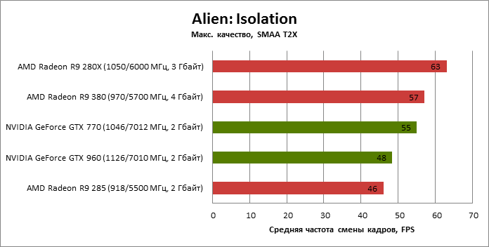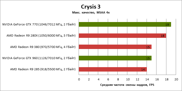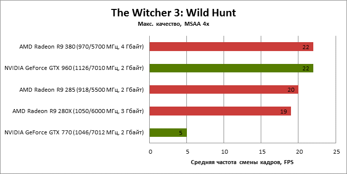 ⇡#Энергопотребление, температура, разгонНаш образец SAPPHIRE NITRO R9 380 довольно неплохо разогнался – до 1095 МГц по частоте GPU и до 5700 МГц по эффективной частоте видеопамяти. На референсных частотах видеокарта остается в пределах энергопотребления, заданных Radeon R9 285, и разгон несущественно повлиял на полученные числа. GeForce GTX 960, как и следовало ожидать, проявил себя как более экономичный видеоадаптер. ![]() ![]() Открытый кулер SAPPHIRE NITRO R9 380 обеспечивает чипу Antigua/Tonga вполне комфортный температурный режим на штатных частотах при автоматическом контроле скорости вентиляторов. У системы охлаждения есть запас мощности для разгона, но существенно снизить температуру можно лишь ценой неприемлемо высокого уровня шума. `⇡#Производительность: синтетические тестыОба синтетических бенчмарка демонстрируют небольшое, но вполне существенное преимущество Radeon R9 380 перед R9 285. Если сравнивать R9 380 с GeForce GTX 960, то 3DMark версии 2011 года отдает предпочтение видеокарте NVIDIA, 3DMark 2013 – наоборот. Графические карты прошлого поколения – Radeon R9 280X и GeForce GTX 770 обеспечивают заметно более высокий уровень производительности. ![]() ![]() ⇡#Unigine Heaven 4В Unigine Heaven разница между R9 380 и R9 285 не превышает 3 кадров в секунду при использованных настойках. GTX 960 показывает лучшие результаты при разрешении 1920 × 1080, но не идет ни в какое сравнение с Radeon R9 380 в режиме WQHD. 1920 × 1080 ![]() 2560 × 1440 ![]() ⇡#Производительность: игры1920 × 1080 В большинстве игр, как и следовало ожидать, увеличенный объем памяти Radeon R9 380 не дает ему осязаемого преимущества перед R9 285. Единственное исключение – Alien: Isolation. В пяти из девяти игровых тестов Radeon R9 380 одержал победу над основным соперником – GeForce GTX 960. Только в Battlefield 4 соотношение обратное. В остальных случаях GTX 960 и R9 380 примерно равны по быстродействию. Впрочем, в абсолютном выражении разница между этими адаптерами невелика. ![]() ![]() ![]() ![]() ![]() ![]() ![]() ![]() ![]() 2560 × 1440 При разрешении WQHD GeForce GTX 960 уже не смог взять реванш ни в одном из игровых тестов. Кроме того, есть три игры (Alien: Isolation, Far Cry 4 и GTA V), в которых недостаточный объем RAM привел видеокарту NVIDIA к сокрушительному поражению. Впрочем, Far Cry 4 и GTA 5 при таких настройках (максимальное качество графики, полноэкранное сглаживание и разрешение 2560 × 1440) не по зубам ускорителям этой категории, даже если снять ограничение по объему памяти. ![]() ![]() ![]() ![]() ![]() ![]() ![]() ![]() ![]() ⇡#Производительность: разгонРазгон видеоадаптеров среднего уровня производительности – как правило, довольно бессмысленное занятие с практической точки зрения. Вот и в данном случае результаты гораздо лучше заметны в синтетических тестах, чем в реальных играх, где весь эффект от довольно существенного повышения частот GPU и RAM сводится к нескольким дополнительным FPS. 3DMark 2011 ![]() 3DMark ![]() Игровые тесты + Unigine Heaven 4 ![]() ![]() ⇡#Производительность: вычисленияРасстановку сил в вычислительных задачах определяет специфика каждого конкретного приложения. Как уже не раз было при сравнении архитектуры AMD GCN с NVIDIA Maxwell, Radeon R9 380 лучше себя проявил в тесте Scientific Analysis пакета SiSoftware Sandra и ускорении рендеринга видео Sony Vegas 13 Pro. В остальных победа осталась за GeForce GTX 960. Luxmark: Room (Complex Benchmark) ![]() Sony Vegas Pro 13 ![]() CompuBench CL: Ocean Surface Simulation ![]() CompuBench CL: Particle Simulation ![]() SiSoftware Sandra 2015: Scientific Analysis ![]() ⇡#ВыводыAMD Radeon R9 380 нельзя назвать по-настоящему новым продуктом. По сравнению с R9 285, обновленной версией которого он, по сути, яв