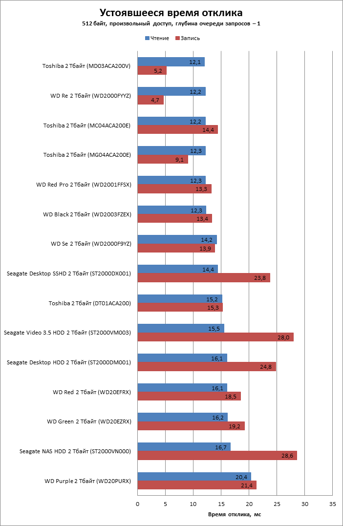 - Устоявшееся время отклика. Выполняется произвольное чтение/запись блоков размером 512 байт с глубиной очереди запросов 1. Тест продолжается в течение 10 мин.