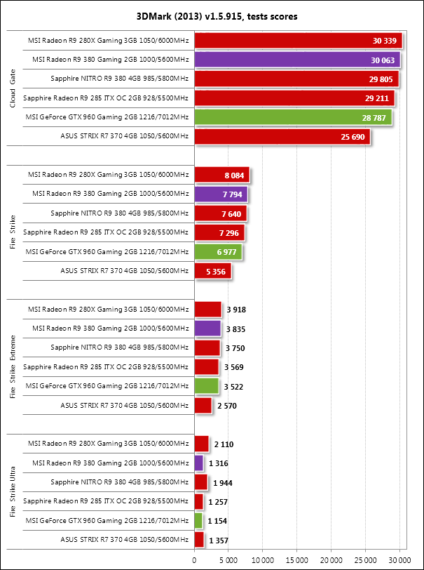 Итак, основная сводная диаграмма сегодня отведена под сравнение производительности MSI Radeon R9 380 Gaming 2 Гбайт и Sapphire NITRO R9 380 4 Гбайт. Обобщим полученные выше результаты.