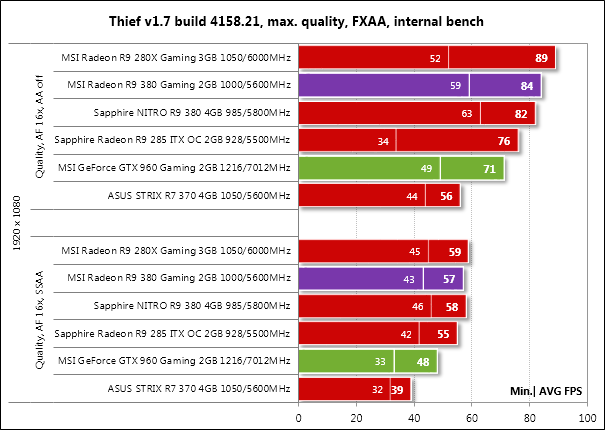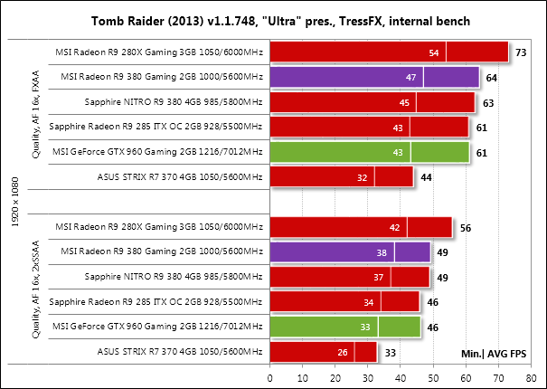На следующей сводной диаграмме мы оценим преимущество MSI Radeon R9 380 Gaming 2 Гбайт на графическом процессоре Antigua Pro перед Sapphire Radeon R9 285 ITX Compact OC Edition 2 Гбайт на таком же графическом процессоре, но с названием Tonga.