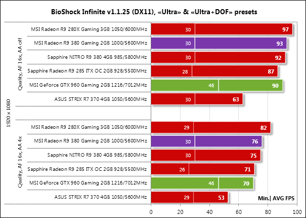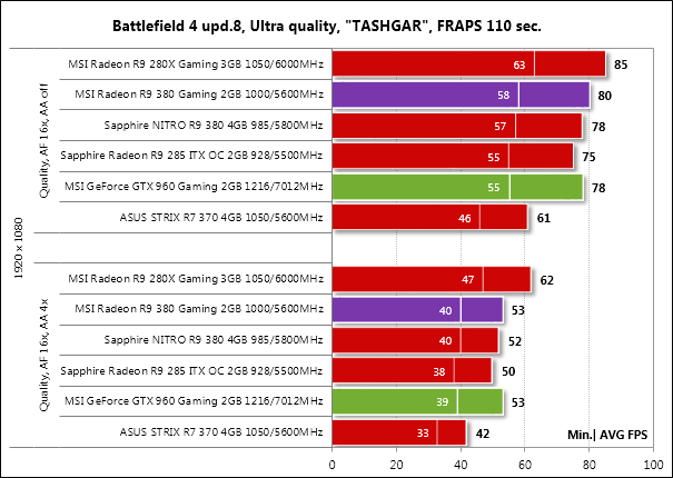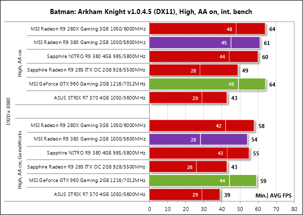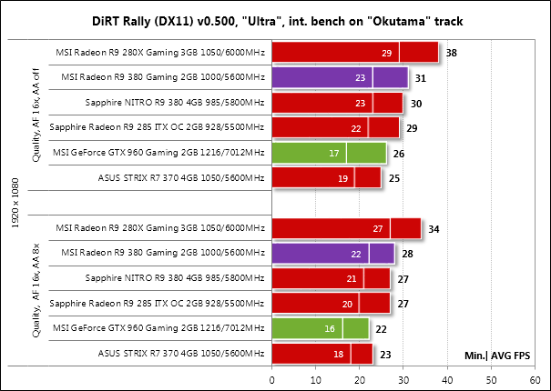 В оставшихся двух играх – DiRT Rally и Batman: Arkham Knight – никакого преимущества Sapphire NITRO R9 380 4 Гбайт перед MSI Radeon R9 380 Gaming 2 Гбайт нет.