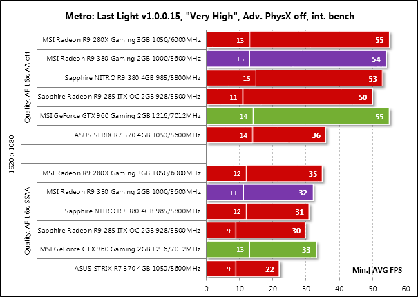Надежды увидеть разницу в производительности между MSI Radeon R9 380 Gaming 2 Гбайт и Sapphire NITRO R9 380 4 Гбайт в игре Metro: Last Light также не оправдались.