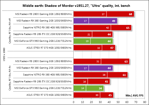 Middle-earth: Shadow of Mordor стала первой игрой, где Sapphire NITRO R9 380 4 Гбайт удалось продемонстрировать впечатляющее превосходство над MSI Radeon R9 380 Gaming 2 Гбайт и одновременно практически не отстать от MSI Radeon R9 280X Gaming 3 Гбайт.