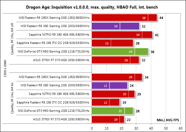На диаграммах результаты тестирования MSI Radeon R9 380 Gaming мы выделили лиловой заливкой, показатели четырёх других видеокарт на графических процессора AMD отражены тёмно-красным цветом. Для результатов единственной сегодня видеокарты на графическом процессоре NVIDIA мы выбрали традиционный светло-зелёный цвет заливки. Добавим, что на диаграммах в каждом режиме качества результаты тестов видеокарт отсортированы сверху-вниз в порядке убывания их стоимости.