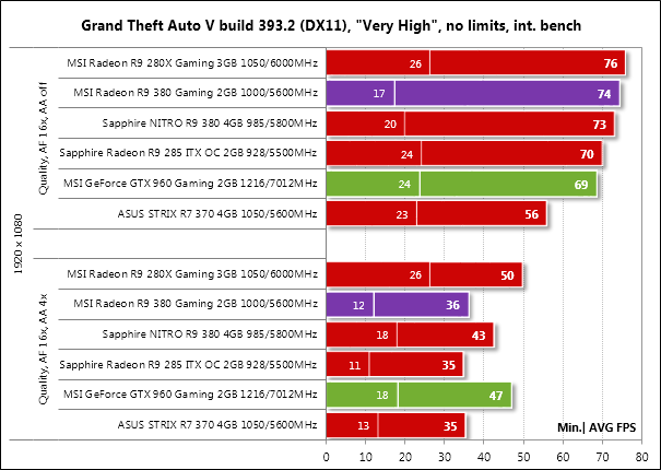 В тесте Grand Theft Auto V разница между двумя версиями Radeon R9 380 видна только в режиме с использованием сглаживания.