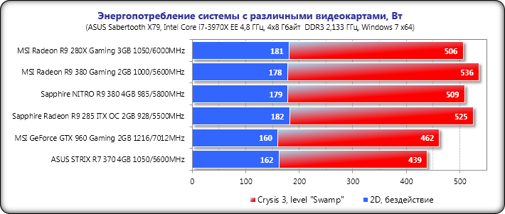 Система с видеокартой MSI Radeon R9 380 Gaming 2 Гбайт оказалась наиболее требовательной к мощности блока питания, потребляя в пике нагрузки 536 ватт. На втором месте идёт система с Sapphire Radeon R9 285 ITX Compact OC Edition 2 Гбайт, а третье заняли конфигурации с MSI Radeon R9 280X Gaming 3 Гбайт и Sapphire NITRO R9 380 4 Гбайт, но разница не такая уж и большая, как это может показаться на первый взгляд. Наиболее экономичными оказались системы с MSI GeForce GTX 960 Gaming 2 Гбайт и в особенности с ASUS STRIX R7 370 4 Гбайт. Впрочем, последнее вполне закономерно. Эти же системы потребляют меньше всего электроэнергии и без нагрузки, что делает их наиболее экономичными в сегодняшнем тесте.