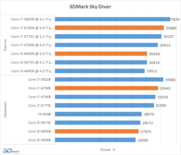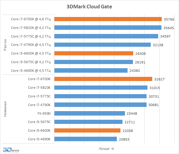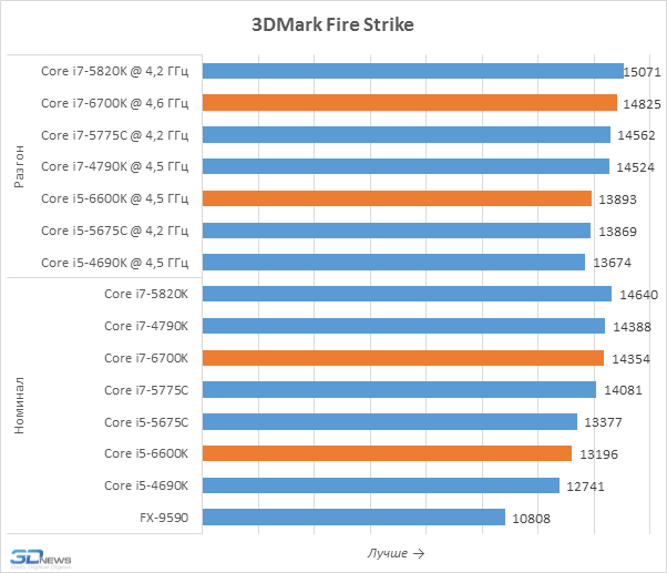 Бенчмарк 3DMark, оценивающий производительность графической подсистемы, выдаёт немного более позитивную для Skylake-S картину. Однако речь об убедительном преимуществе вновь не идёт. Превосходство Core i7-6700K и Core i5-6600K над предшественниками, там, где оно есть, не выходит за пределы 5-процентного уровня.