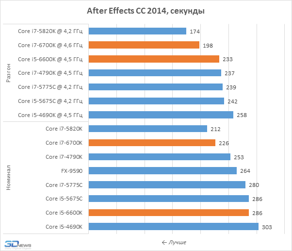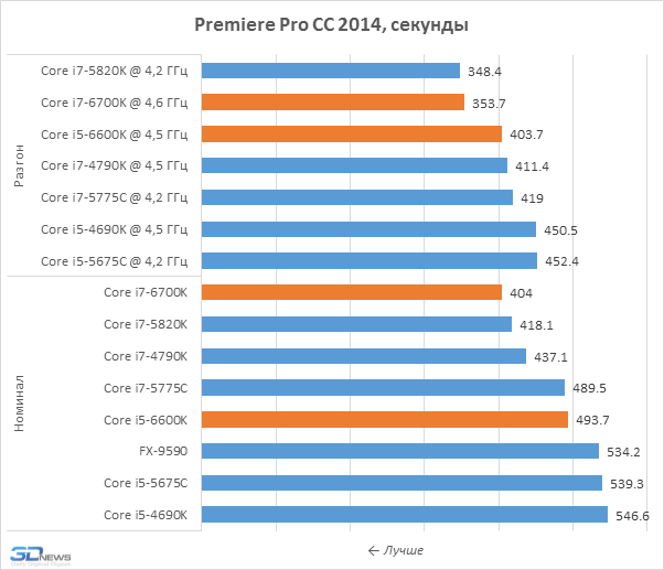 Комплексно охарактеризовать ситуацию несложно. В среднем процессоры Skylake-S могут предложить лишь небольшое преимущество перед предшественниками поколений Haswell и Broadwell. Однако существуют далеко не единичные частные случаи, когда уровень превосходства Core i7-6700K над Core i7-4790K и Core i5-6600K над Core i5-4690K может доходить до 10-процентов. Как и прогнозировалось, такая картина наблюдается в задачах, связанных с обработкой видео, в частности в Adobe Premiere Pro и Adobe After Effects, а также при задействовании современного кодера x265. Но в целом новое поколение процессоров, как это обычно и бывает, приносит лишь 5-процентное улучшение быстродействия.