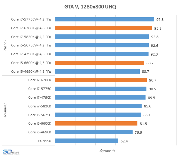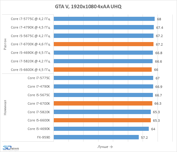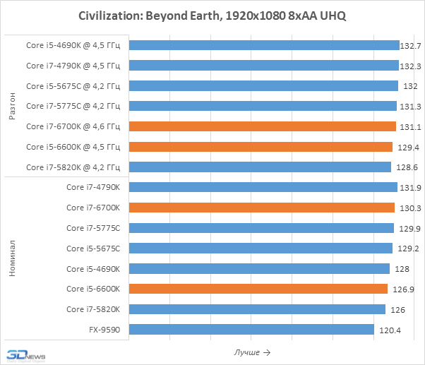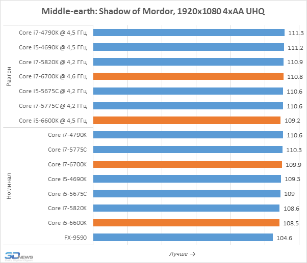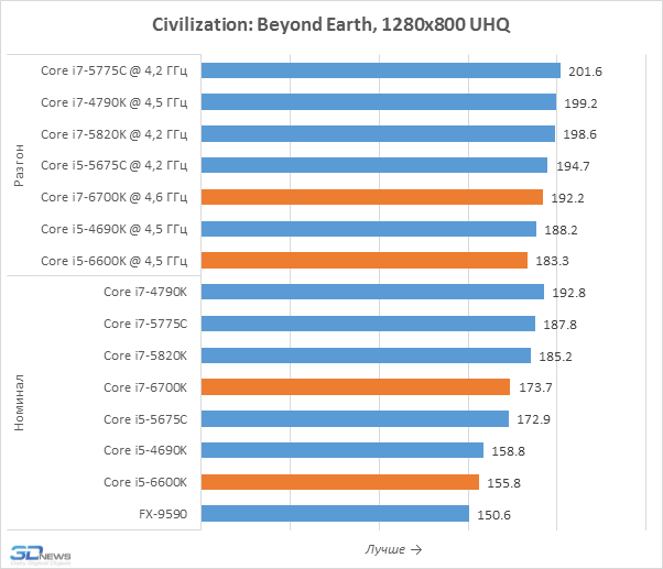 Честно говоря, увидеть какие-то значимые различия в производительности Skylake-S и процессоров предшествующих поколений тут решительно невозможно. И новинки, и десктопные Haswell или Broadwell-DT обладают вполне достаточной мощностью для того, чтобы полностью загрузить флагманскую видеокарту, а большего от них и не требуется. Иными словами, для игровых систем с производительной дискретной графикой Core i7-6700K и Core i5-6600K вполне подходят. Хотя если пристально присмотреться к результатам, то можно заметить микроскопическое отставание носителей микроархитектуры Skylake от процессоров Devil’s Canyon. Впрочем, возникнуть оно могло и не по вине процессоров, а из-за новой материнской платы с набором логики Intel Z170, BIOS которой ещё не отшлифован до безупречного блеска.