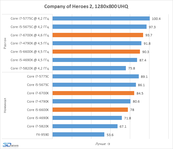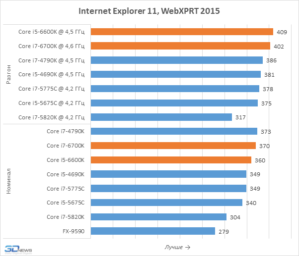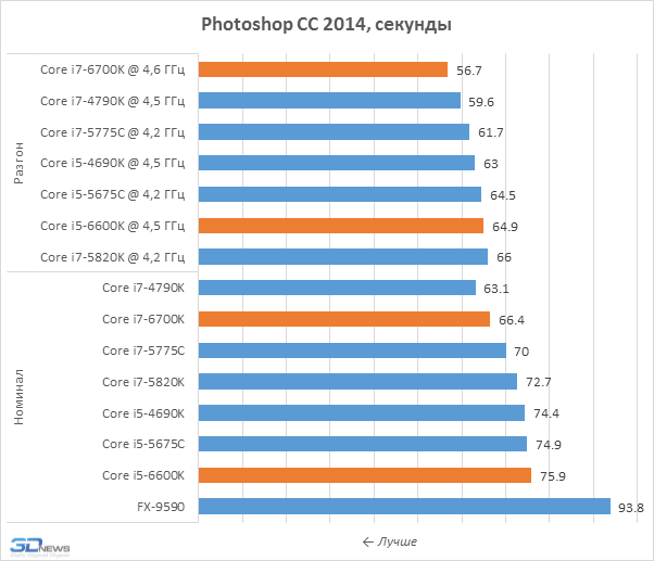 На этом не слишком радостном фоне отдельного упоминания заслуживает производительность при разгоне, вносящая в общую картину отчётливые нотки оптимизма. Например, Core i7-6700K можно разогнать немного сильнее по сравнению с Core i7-4790K или Core i7-5775C как в относительном, так и в абсолютном выражении. И в оверклокерских системах Skylake-S демонстрирует более заметное преимущество перед предшественниками, доходящее в среднем до 12-13 процентов.