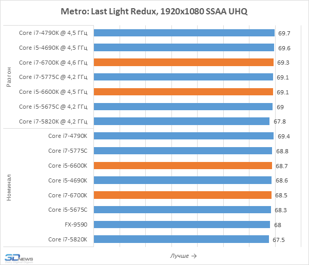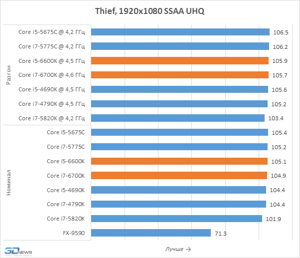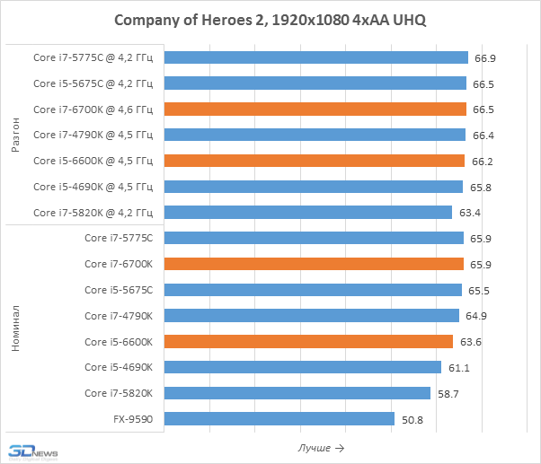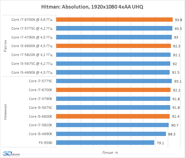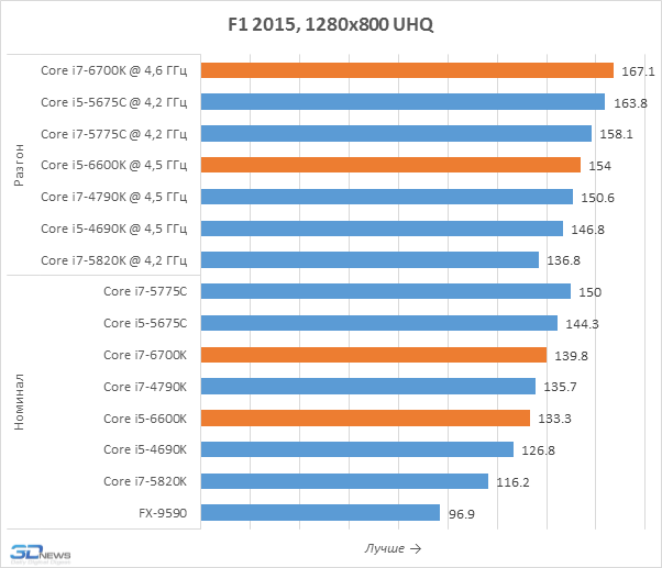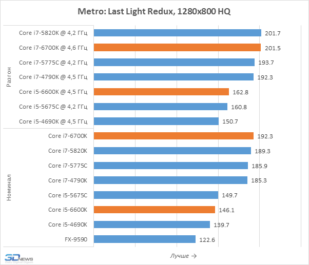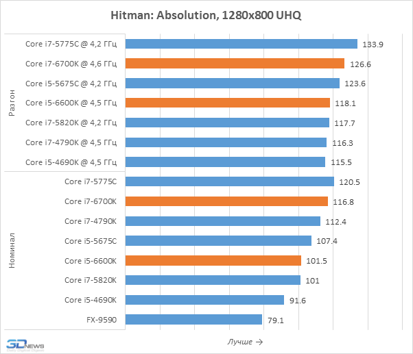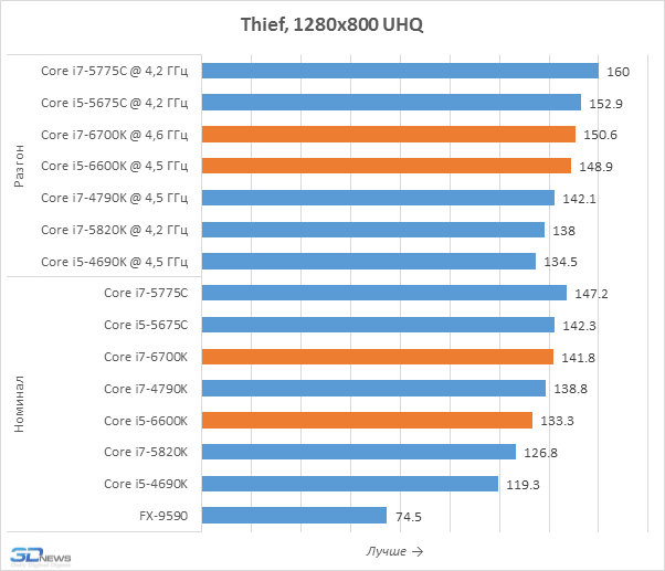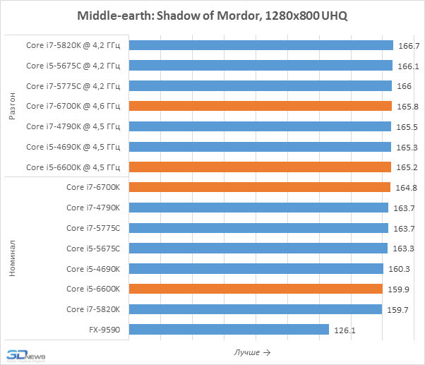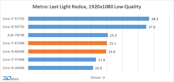 Тесты в уменьшенном разрешении позволяют лучше выявлять влияние процессоров на игровую производительность, именно поэтому мы их и проводим. Но приведённые на диаграммах результаты вряд ли можно считать позитивными для Core i7-6700K и Core i5-6600K. Дело в том, что они оказались медленнее представителей семейства Broadwell-DT, располагающих 128-мегабайтным дополнительным eDRAM-кешем, положительно влияющим на игровую производительность. В Skylake-S такого кеша нет и эти новинки могут похвастать лишь лучшим быстродействием по сравнению с Haswell, но Core i7-5775C и Core i5-5675C кажутся потенциально более интересными вариантами для геймерских систем. Впрочем, всё это не значит, что нас не удовлетворило игровое быстродействие Skylake-S. Напротив, Core i7-6700K, например, выдаёт даже более высокую частоту кадров, чем Core i7-5820K для платформы LGA2011-v3, а это – весьма впечатляющее достижение.