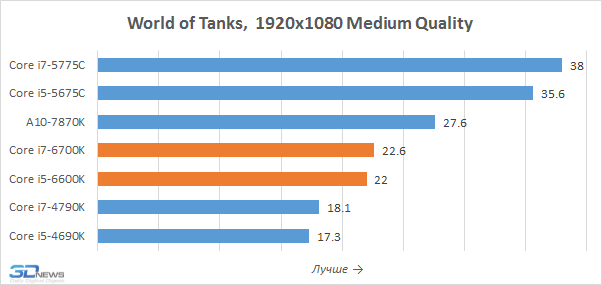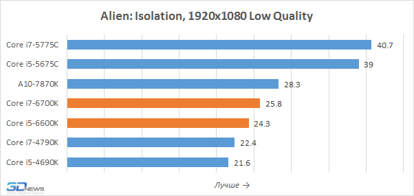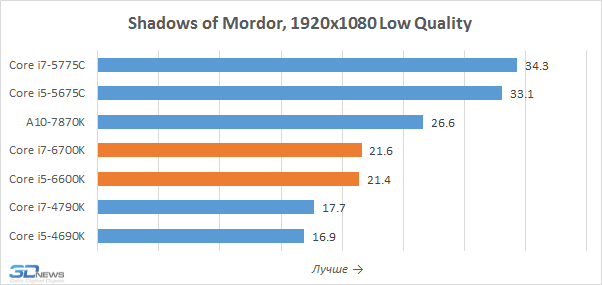 Графическое ядро Intel HD Graphics 530, встроенное в процессоры Skylake-S, действительно позволяет добиться более высокой игровой производительности, чем в случае Intel HD Graphics 4600 из процессоров Haswell. Уровень преимущества составляет порядка 20-25 процентов, и в ряде случаев интеловские новинки по частоте кадров даже приближаются к показателям AMD A10-7870K. Однако безусловными лидерами в тестах интегрированной графики остаются представители семейства Broadwell-DT, как минимум в полтора раза превосходящие и Core i7-6700K, и Core i5-6600K.