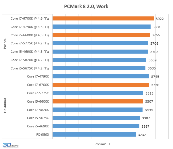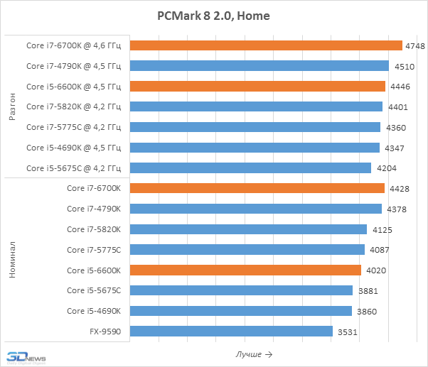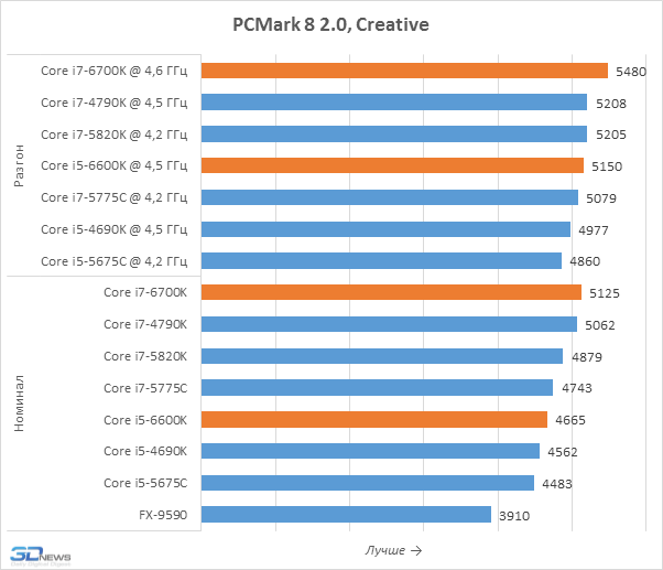 Популярное тестовое приложение PCMark 8 2.0 измеряет производительность систем при типичной пользовательской нагрузке, создаваемой распространёнными приложениями. И согласно результатам, полученным в этом бенчмарке, процессоры Skylake-S способны предложить более высокое быстродействие по сравнению с их предшественниками. Правда, уровень этого преимущества нельзя назвать впечатляющим: Core i7-6700K почти не обгоняет Core i7-4790K, а разница в производительности Core i5-6600K и Core i5-4690K составляет всего 3-4 процента. Более заметное преимущество представителей поколения Skylake можно наблюдать лишь перед процессорами Broadwell, которые обладают существенно более низкой тактовой частотой из-за ограниченного теплового пакета.