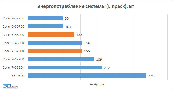 К сожалению, потребление процессоров Skylake-S при отсутствии нагрузки мы адекватно оценить не смогли. Дело в том, что из-за ошибки в текущей версии BIOS используемая нами материнская плата ASUS Z170-Deluxe при включении полного набора энергосберегающих технологий работала крайне нестабильно, а отключение энергосберегающих состояний C-state приводило к излишнему и неоправданному росту потребления при простое CPU. Но вот при вычислительной нагрузке картина получилась следующей.