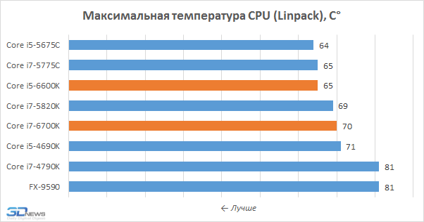 Самые высокие температуры наблюдаются у процессоров Devil’s Canyon, а Skylake-S прогреваются не столь сильно, даже несмотря на то, что из-за новой производственной технологии с 14-нм нормами размер их полупроводникового кристалла уменьшился, а это неминуемо должно было затруднить отвод тепла.