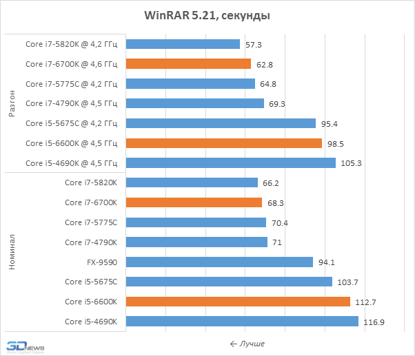 Иными словами, комплексные тесты говорят о том, что, несмотря на все улучшения в микроархитектуре и переход на новую память стандарта DDR4, процессоры нового поколения не могут обеспечить принципиального улучшения производительности современных систем — ни при их работе в номинальном режиме, ни при разгоне.